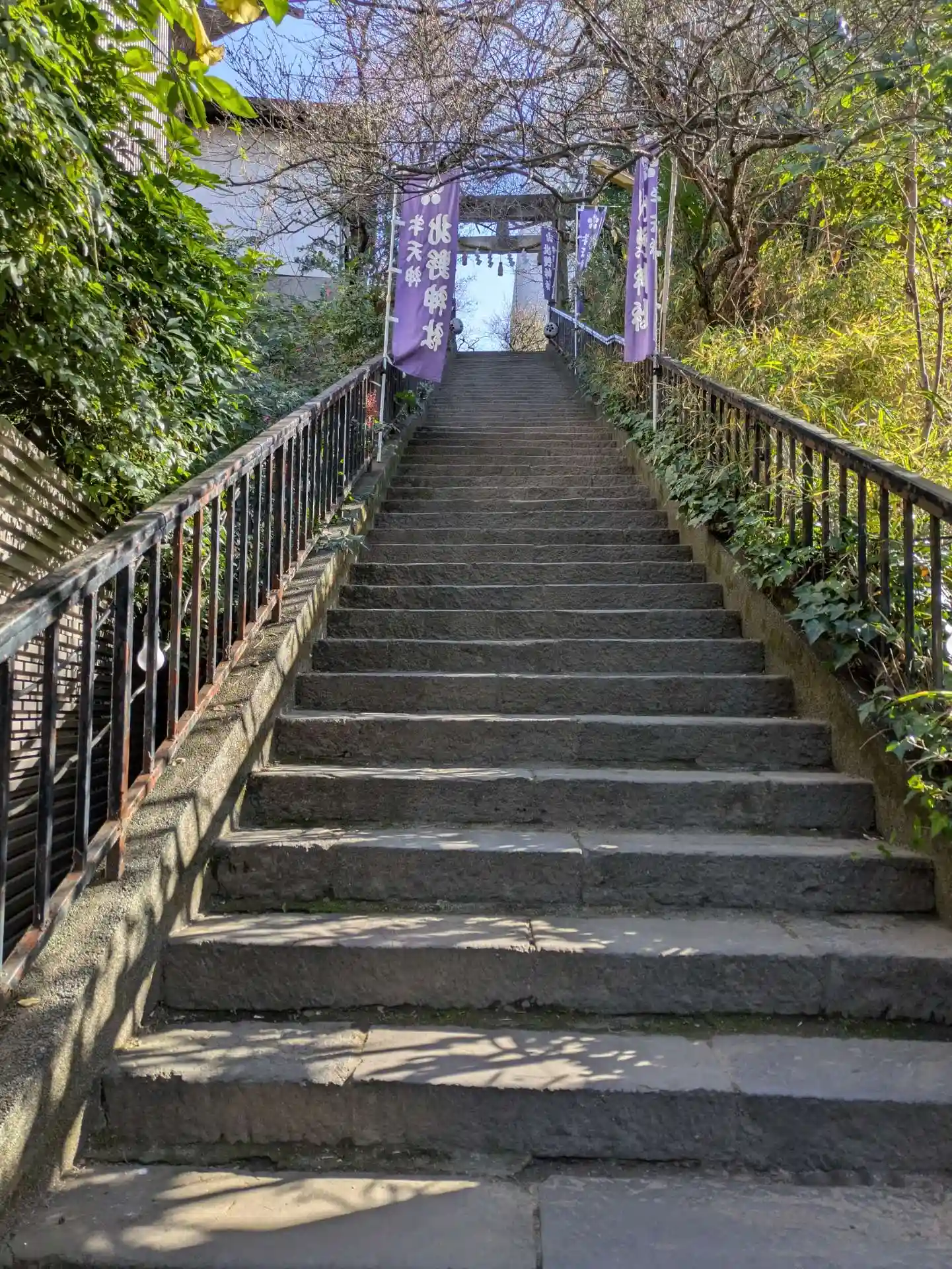 坂の多いまち、鳥居から階段を登って境内にたどり向きます。おそらく春には桜が綺麗なことでしょう。今は紅梅が咲き始め、青空に映えていました。境内の広さに対して参拝客が多く、混み合っていましたが、スタッフを多く配置し、配慮されていました。参拝してまわった小石川諏訪神社、出世稲荷神社、太田神社、高木神社の御朱印もいただきましたが、全て直書きの対応をして下さいました。