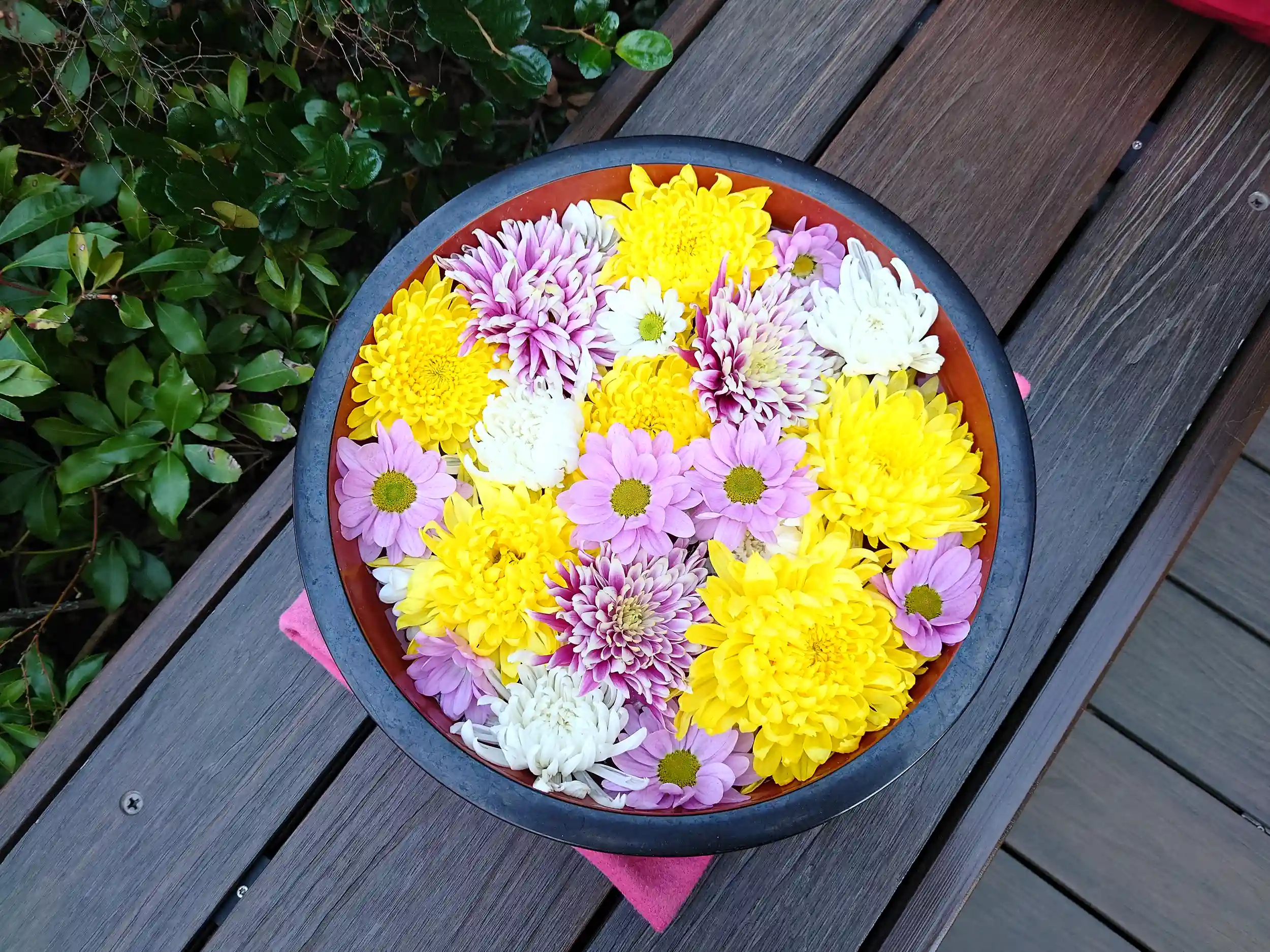 かわいらしい花手水がベンチ(?)の上に置かれていました