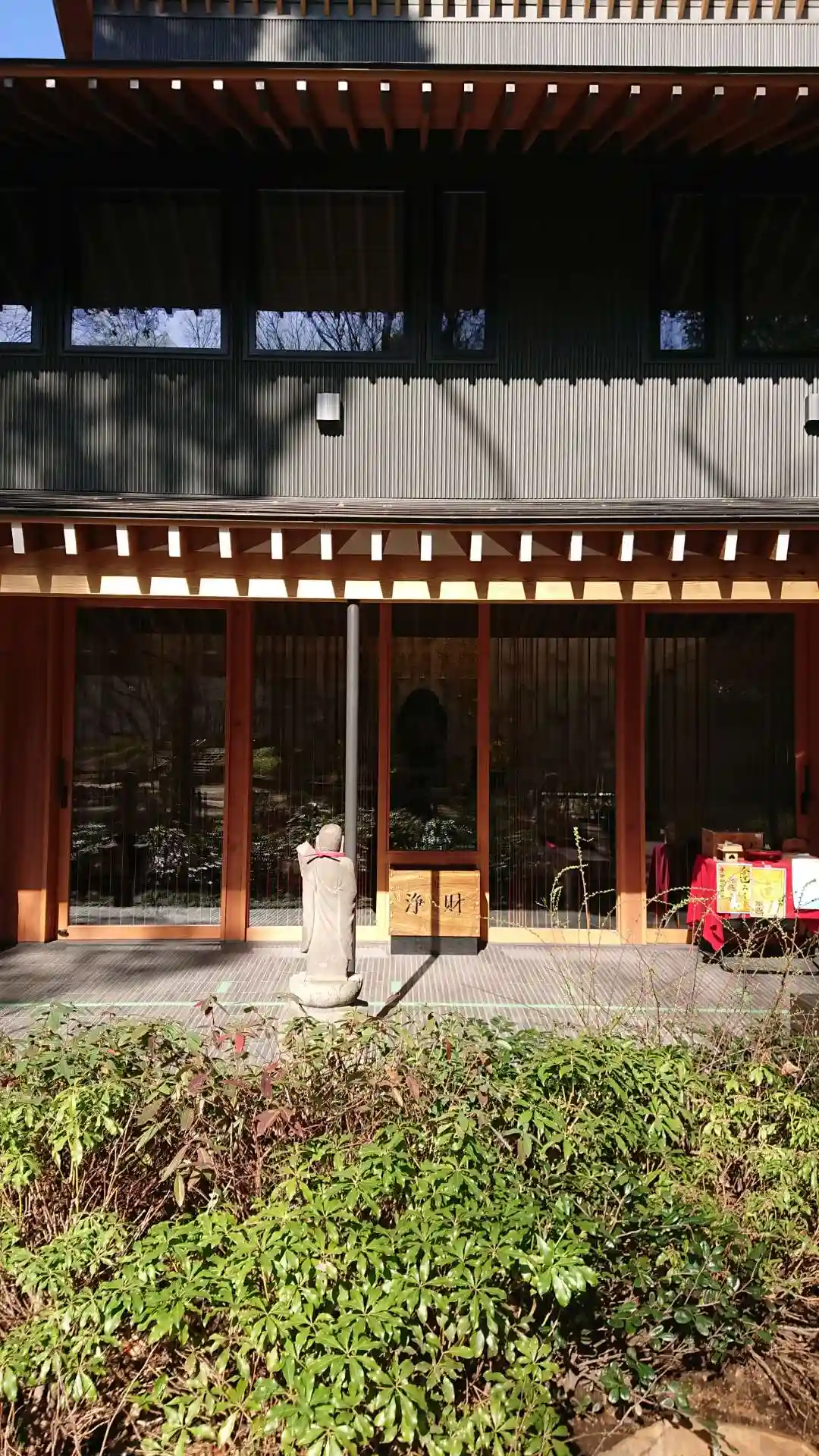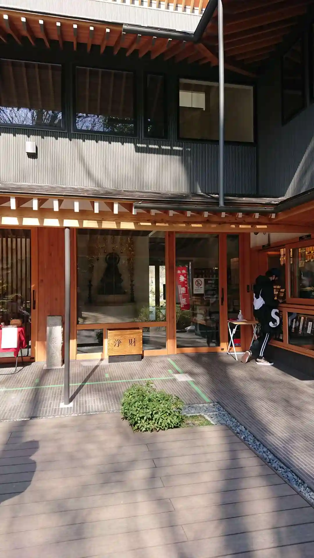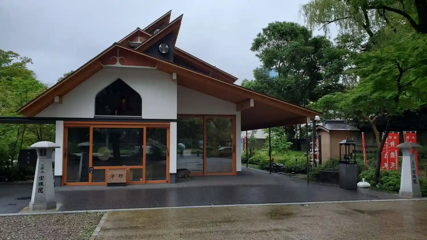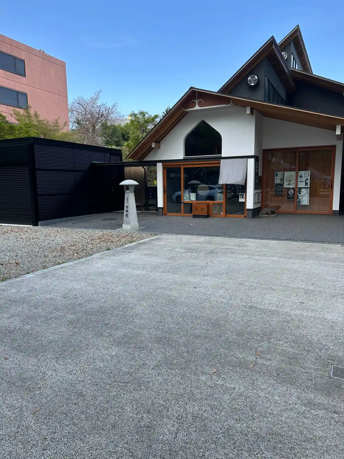 横から見た寺院全景。都会のカフェレストランそのもの。ただ、黒・茶(材木色)・白の配色がナチュラルで嫌みはない。
