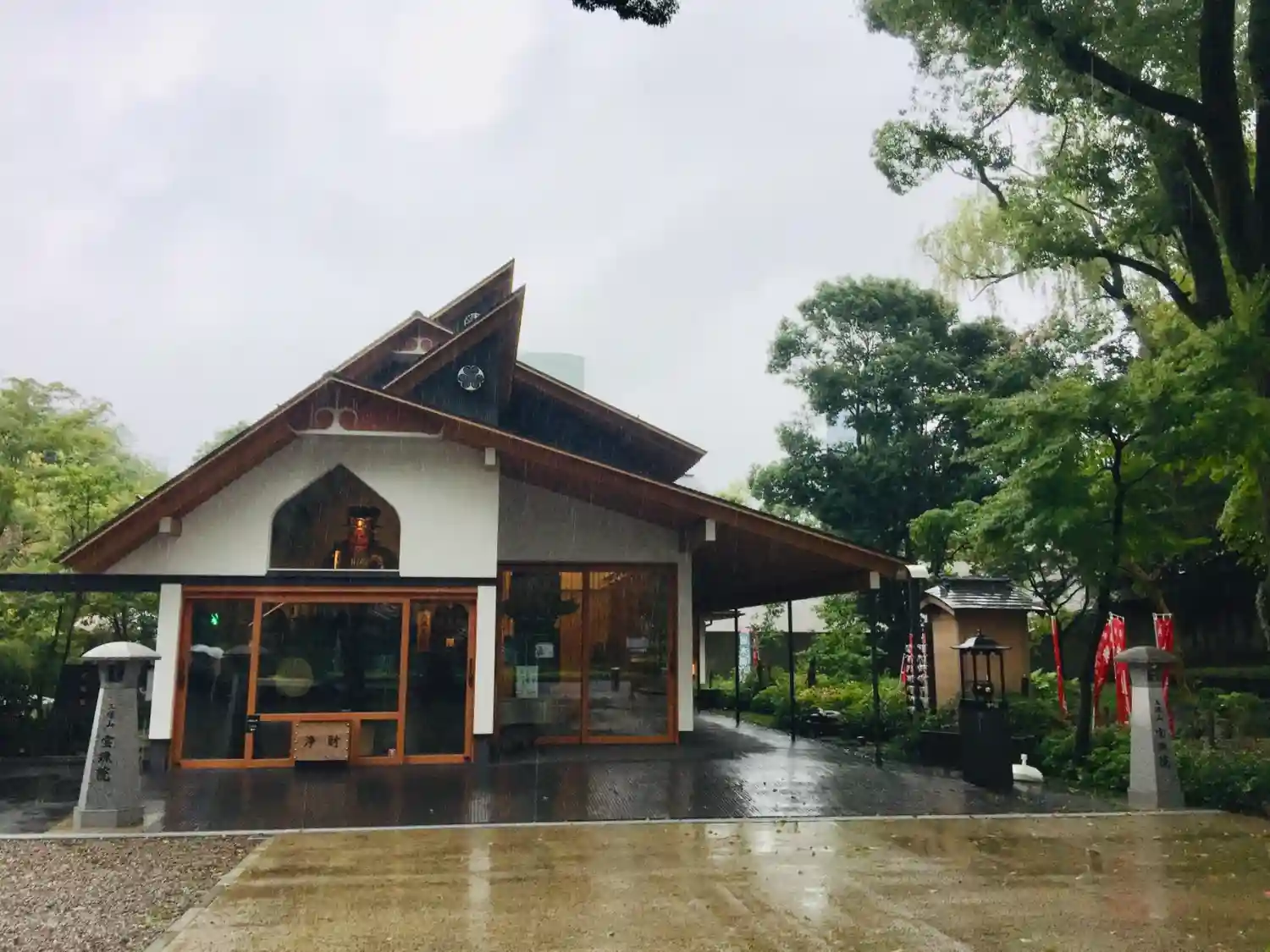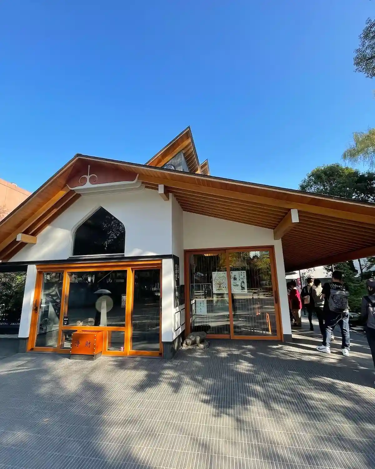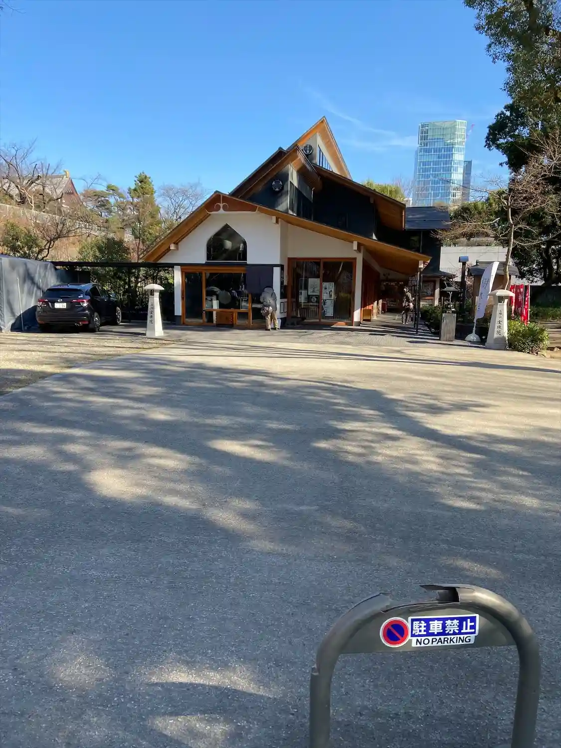 横から見た寺院全景。都会のカフェレストランそのもの。ただ、黒・茶(材木色)・白の配色がナチュラルで嫌みはない。