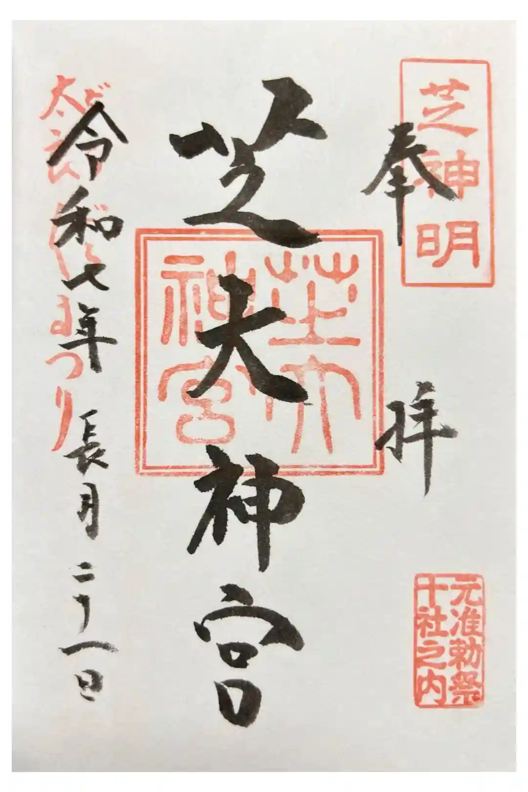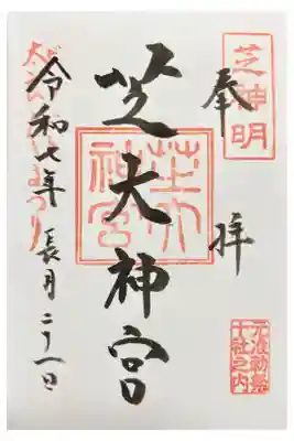 右上に芝明神の印が押された御朱印です。毎月1日には左上に「朔日祈願」の印が押されます。