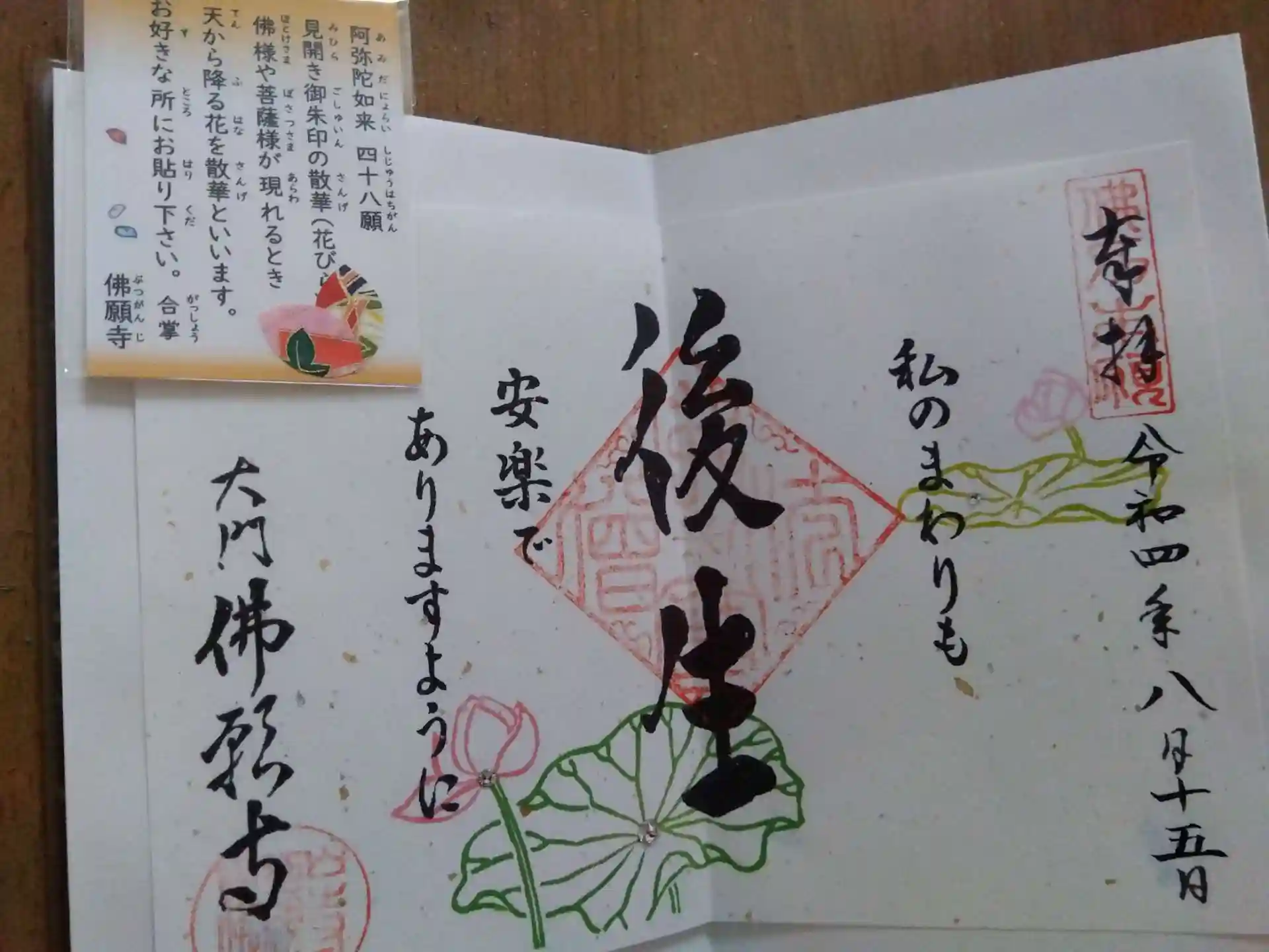 見開きの御朱印に、散華を自分で貼るというスタイルです。