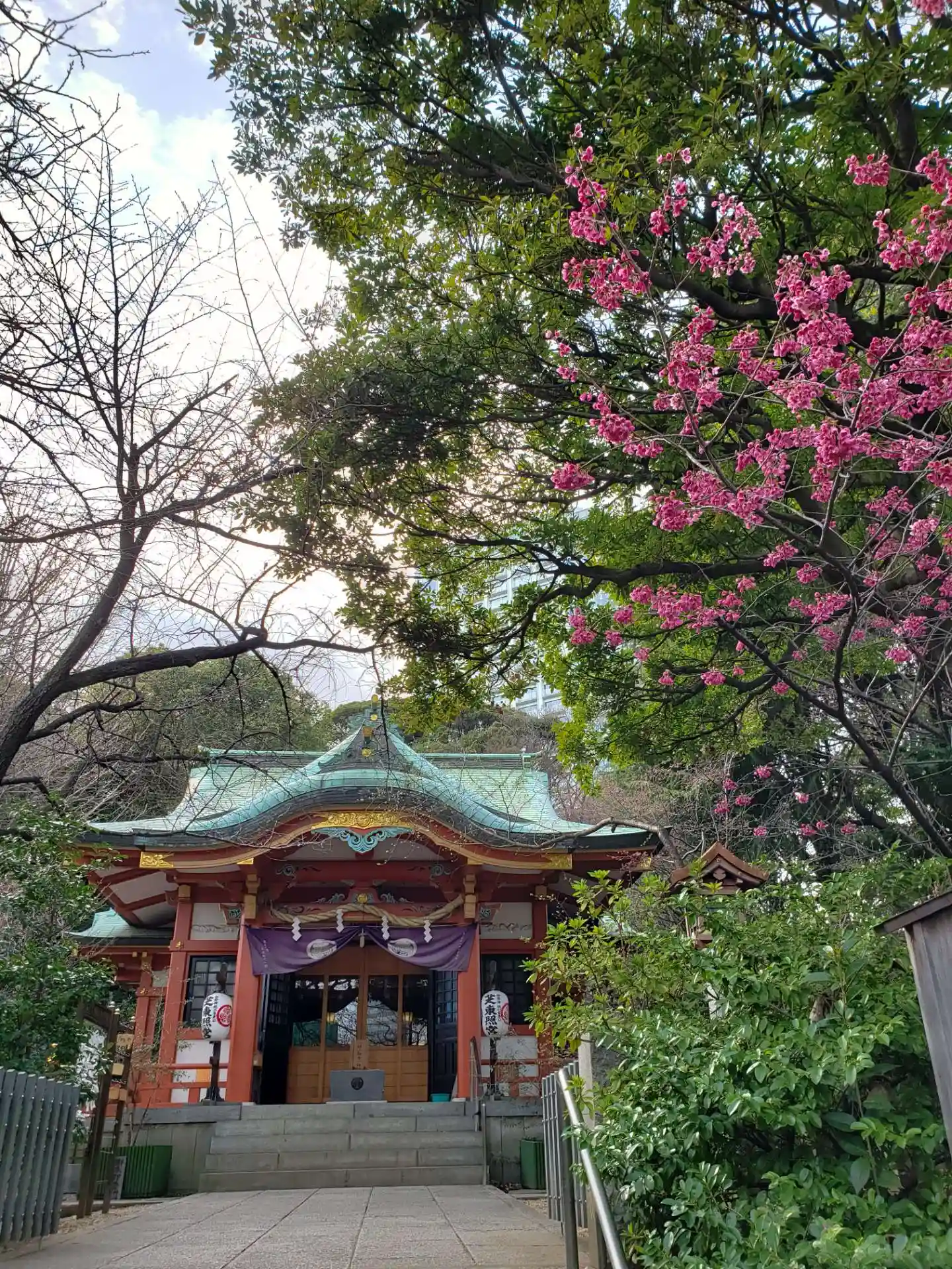 増上寺から並びの公園の桜や桃を見ていたら、遠目に紅梅?らしきもの見えて、それに惹かれて少し歩いてきたら、芝東照宮に辿り着きました。鳥居の先や、手水舎の周りが綺麗でした。