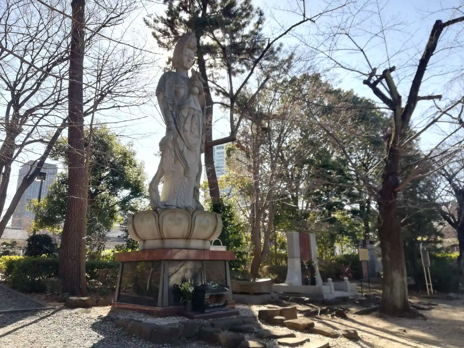 三門をくぐり左側にある観音像。ホテルニュージャパン火災の慰霊のため建立されました。ただし、建立者が火災の責任で有罪判決を受けたホテル経営者なのがなんとも言えず、パフォーマンスの一環として多額のお金を投じたのかと思うと観音様も嘆いておられるように感じます。