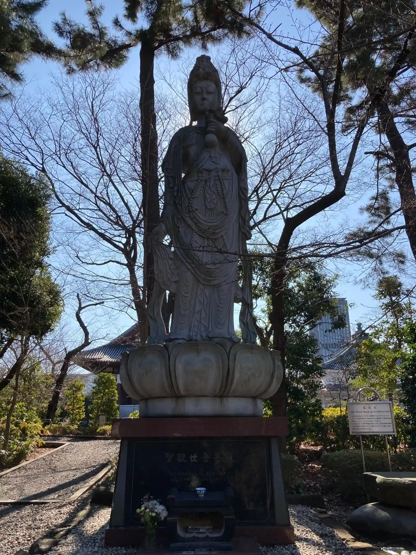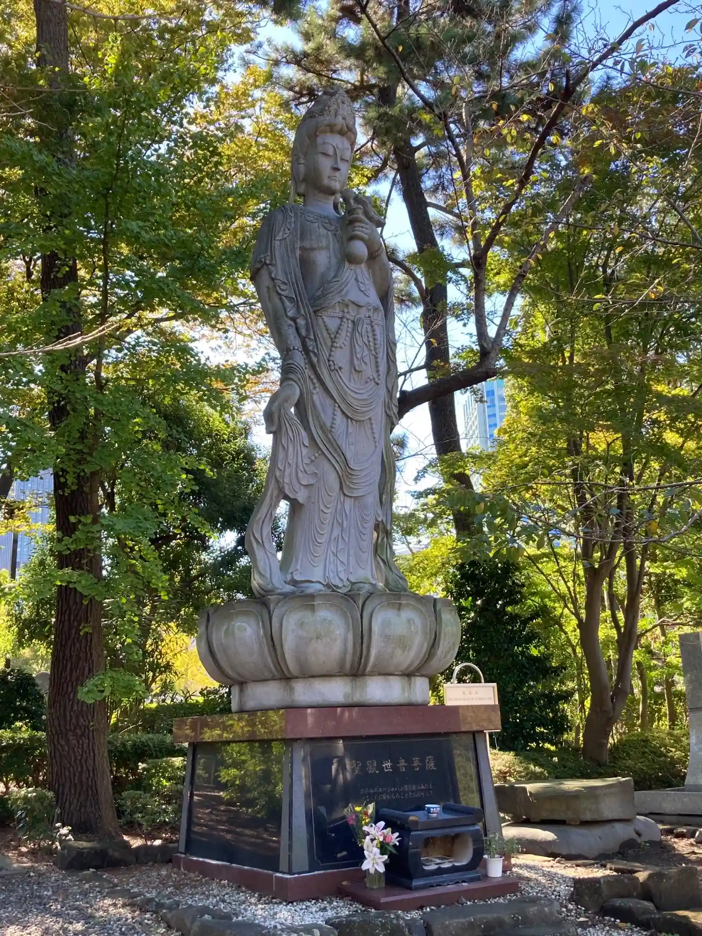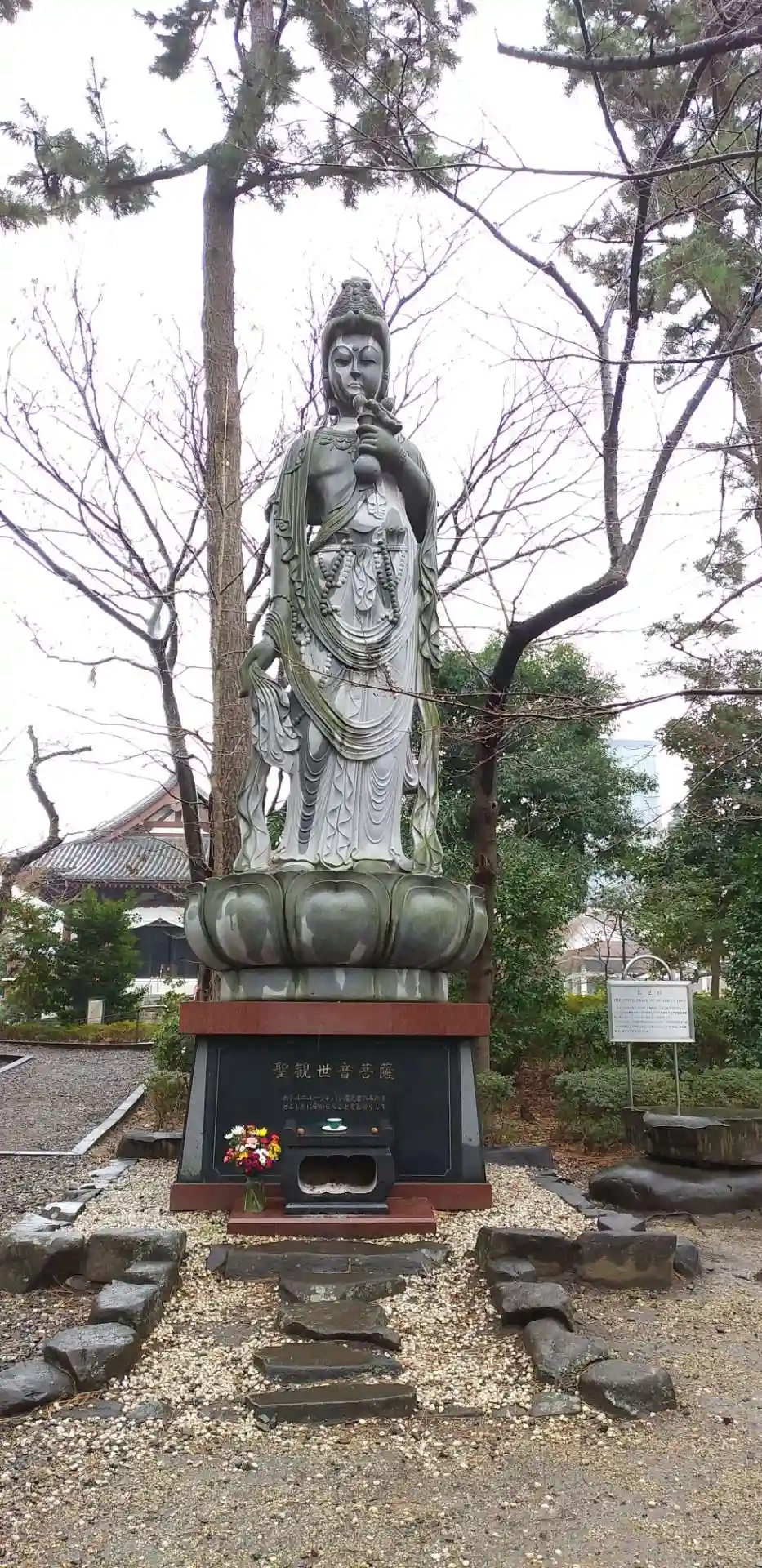 三門をくぐり左側にある観音像。ホテルニュージャパン火災の慰霊のため建立されました。ただし、建立者が火災の責任で有罪判決を受けたホテル経営者なのがなんとも言えず、パフォーマンスの一環として多額のお金を投じたのかと思うと観音様も嘆いておられるように感じます。