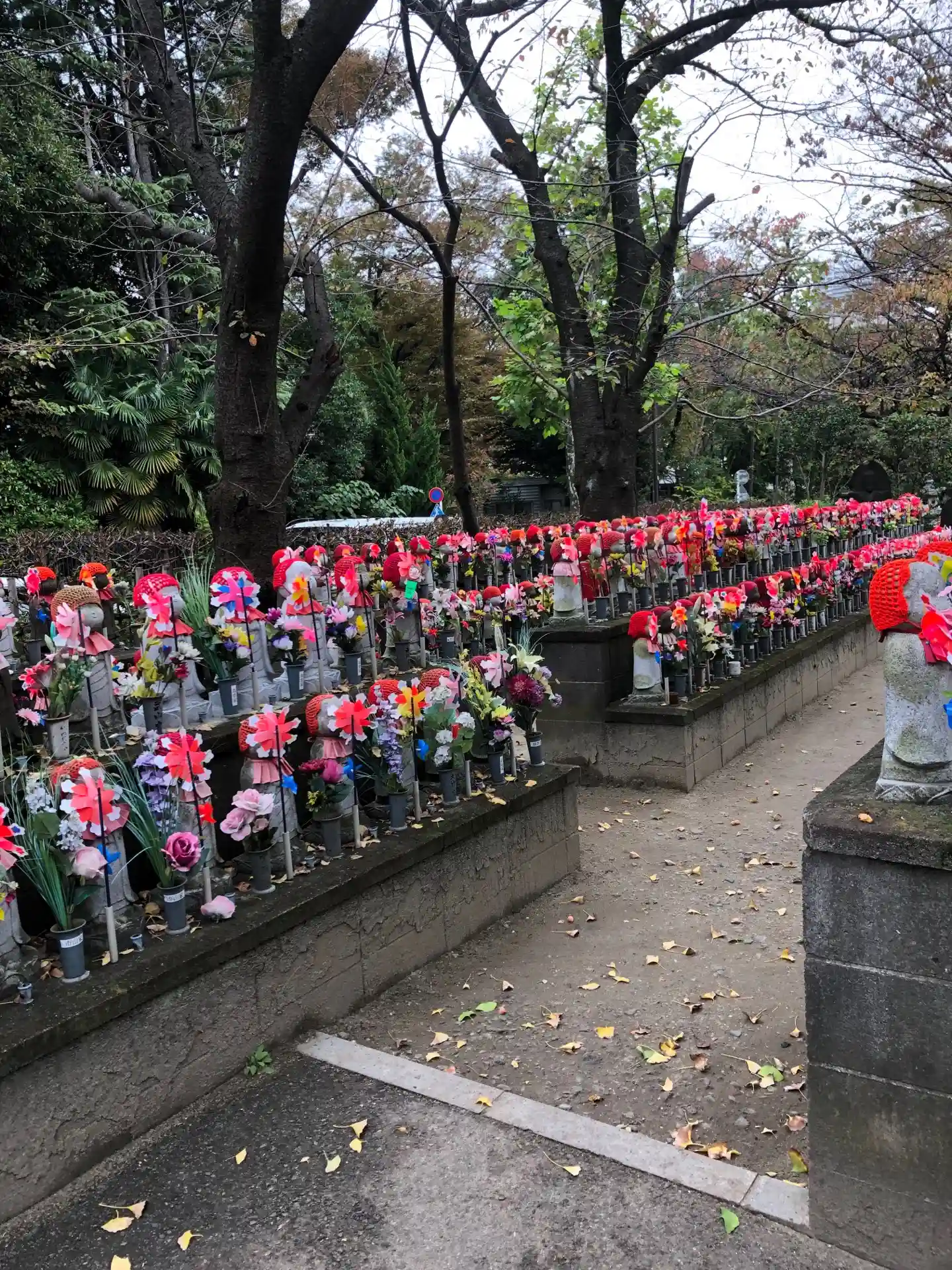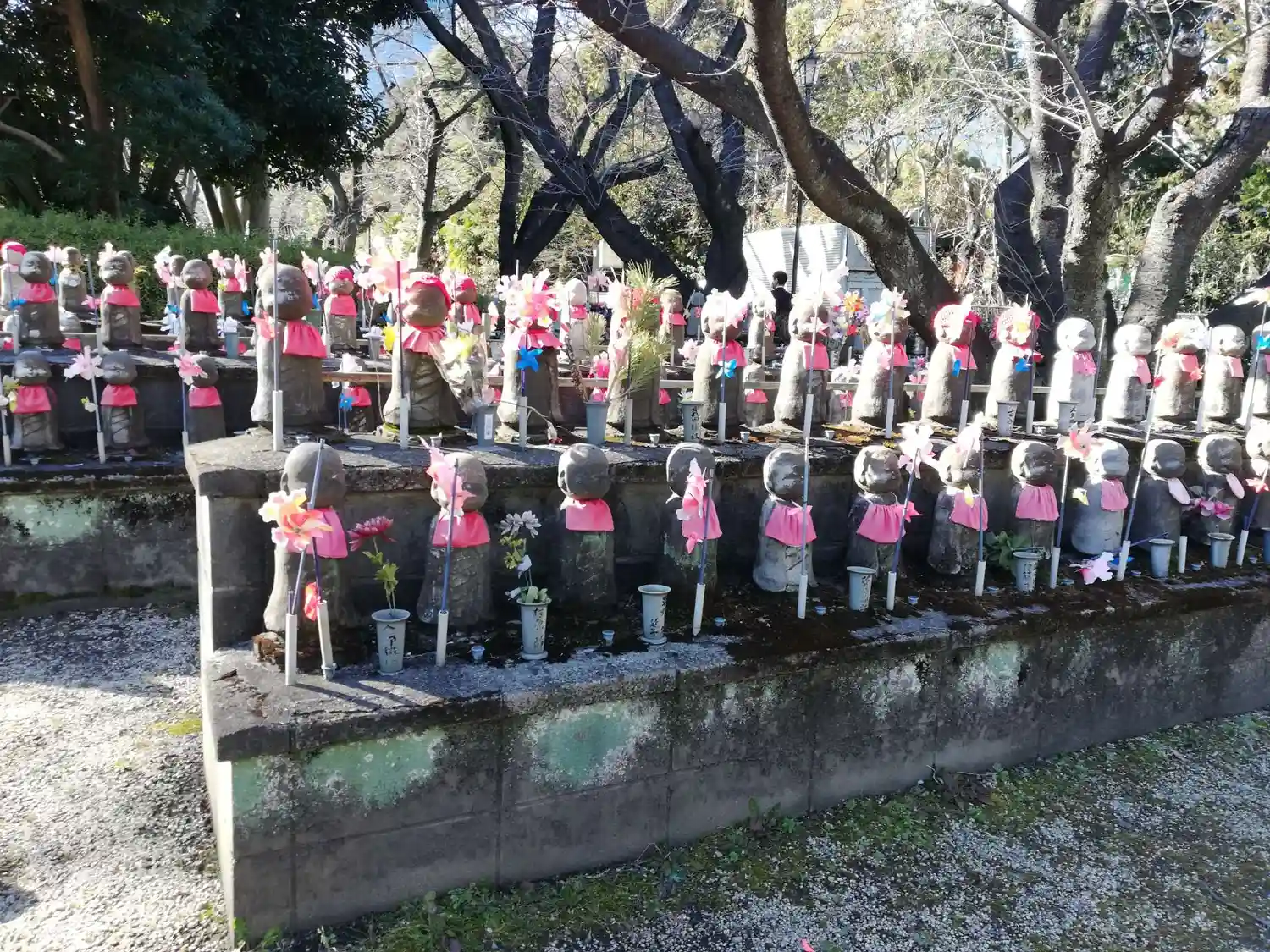 子どもたちの頭を守るため、寒さから守るため、赤い頭巾や前掛けをかぶせているそうです。かわいいお洋服を着せているお地蔵様もありました。