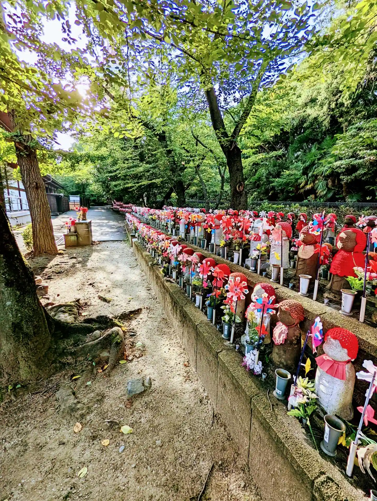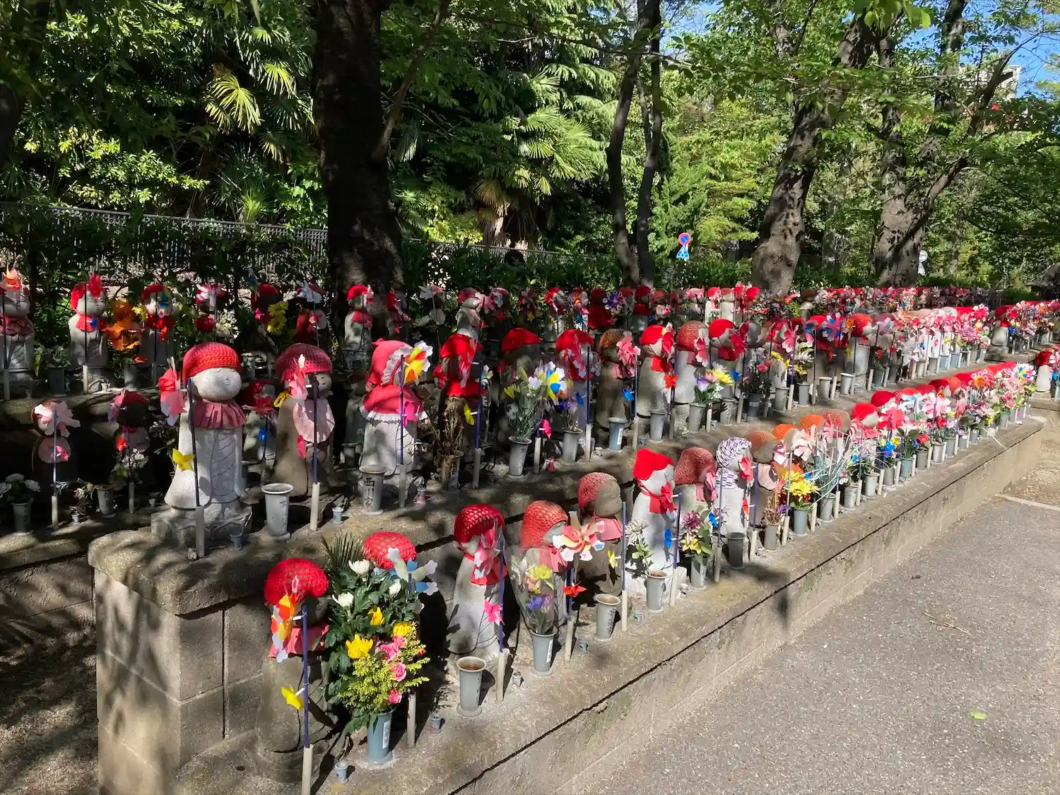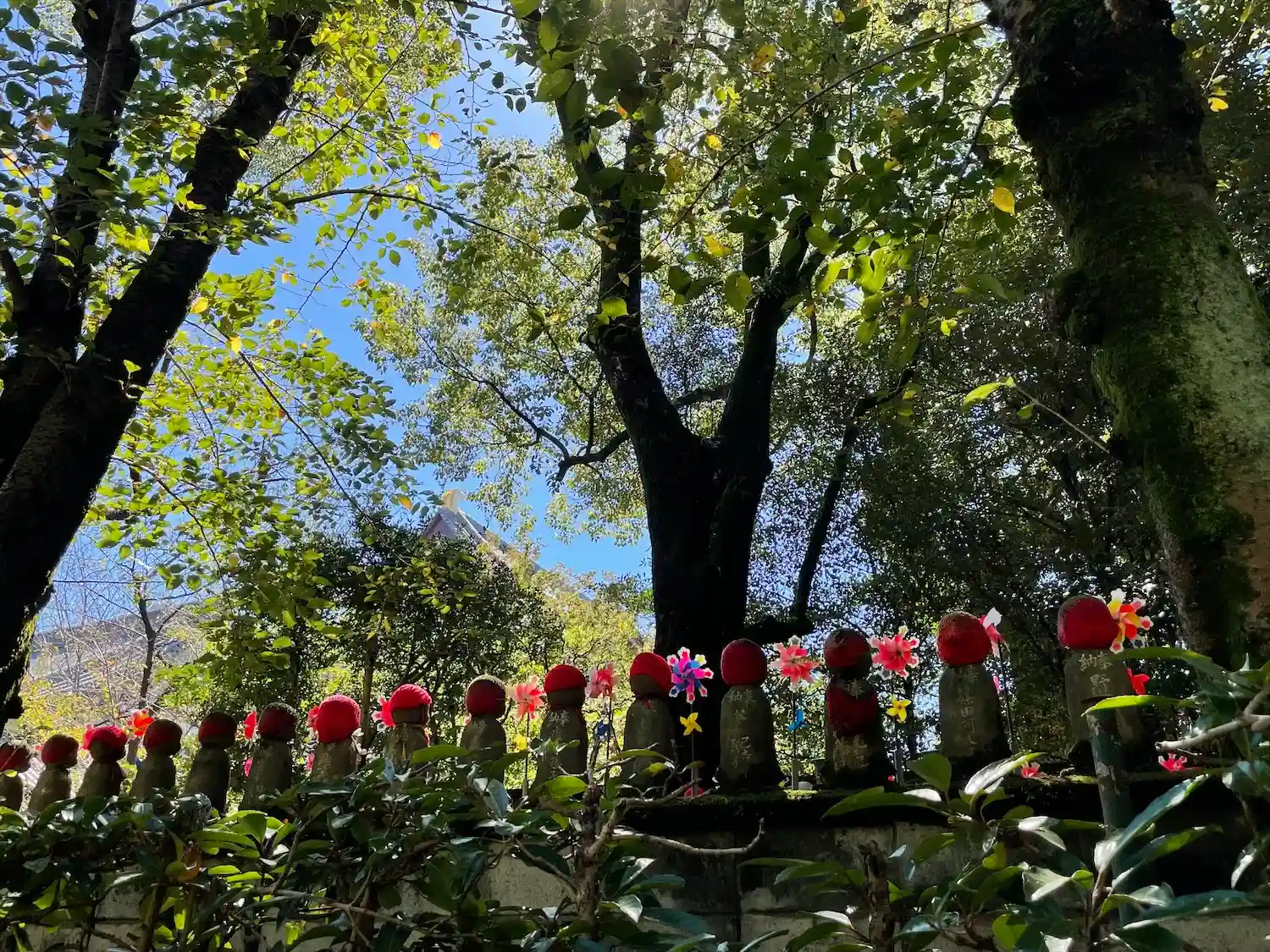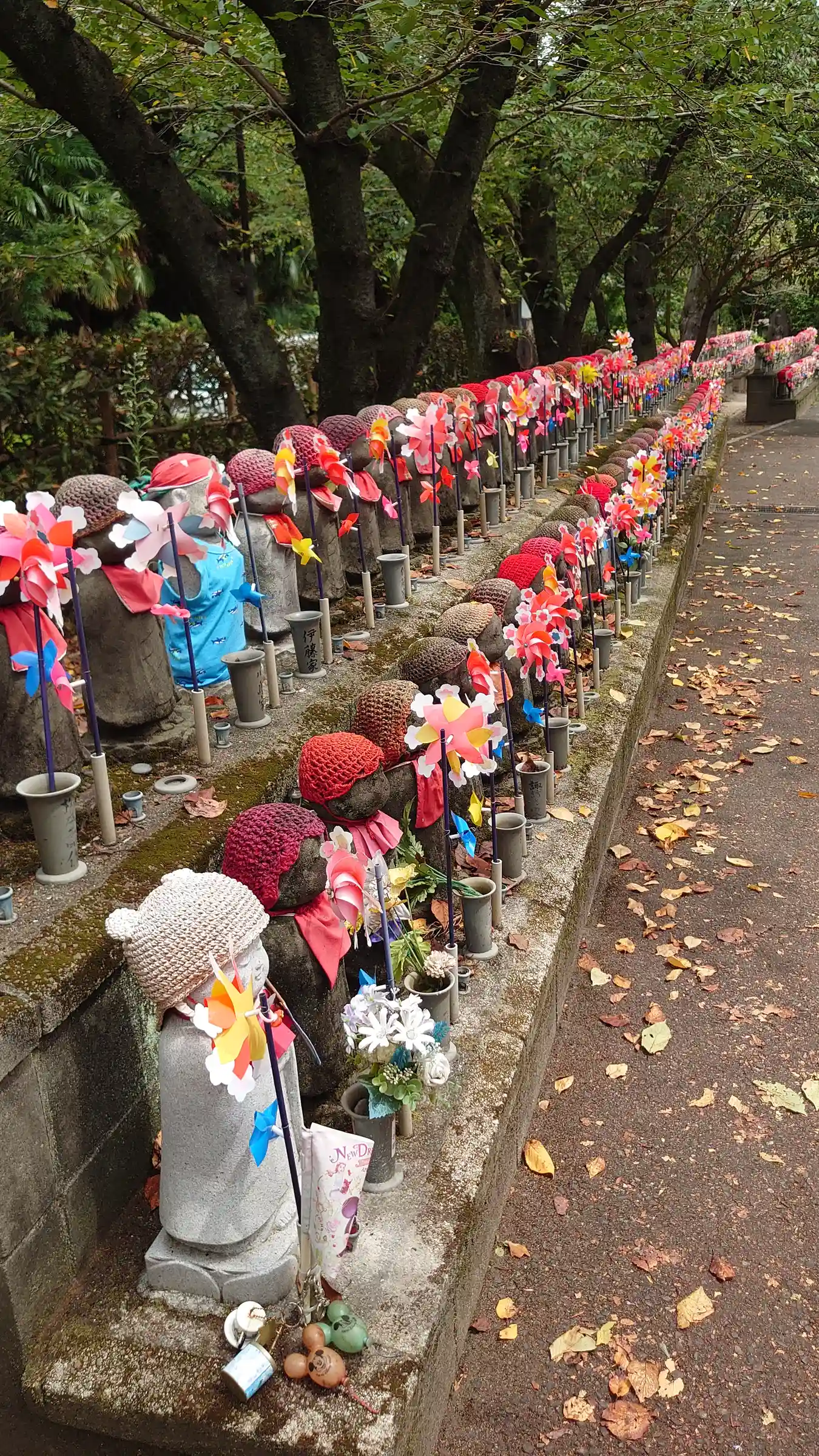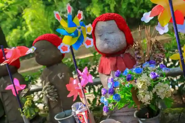 子供たちの健康と成長を願い祀られたのだそう。赤いニット帽とクルクル回る風車が賑やかで可愛らしい。