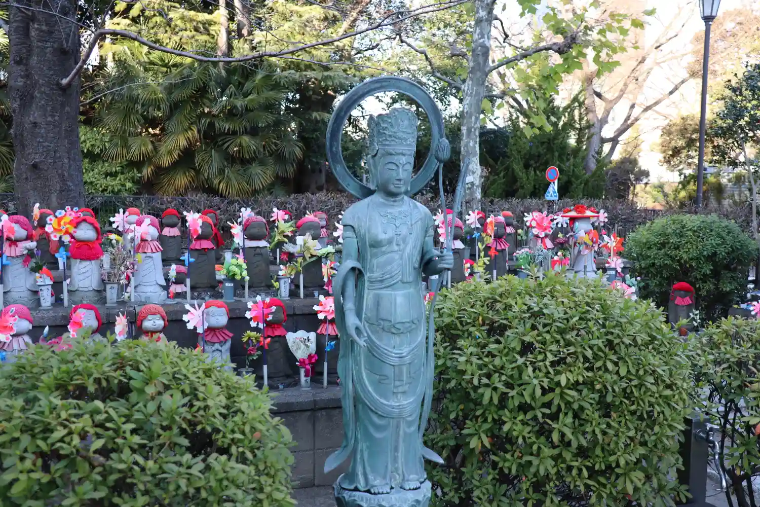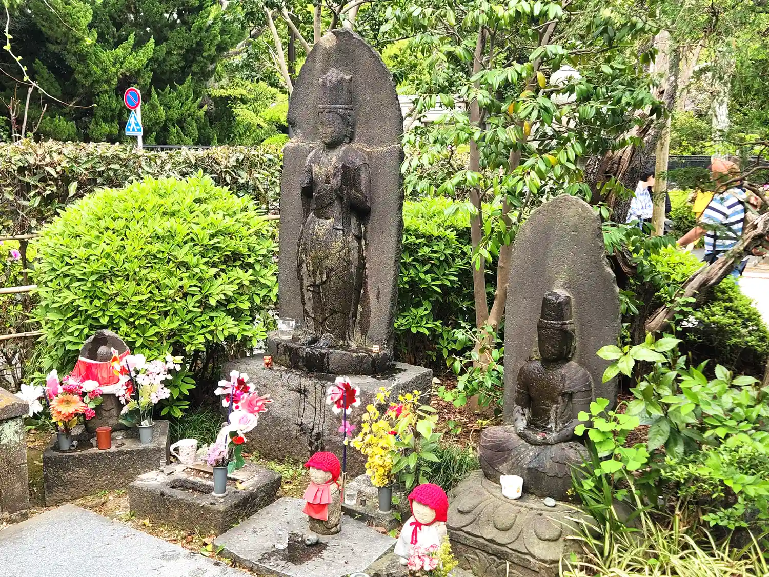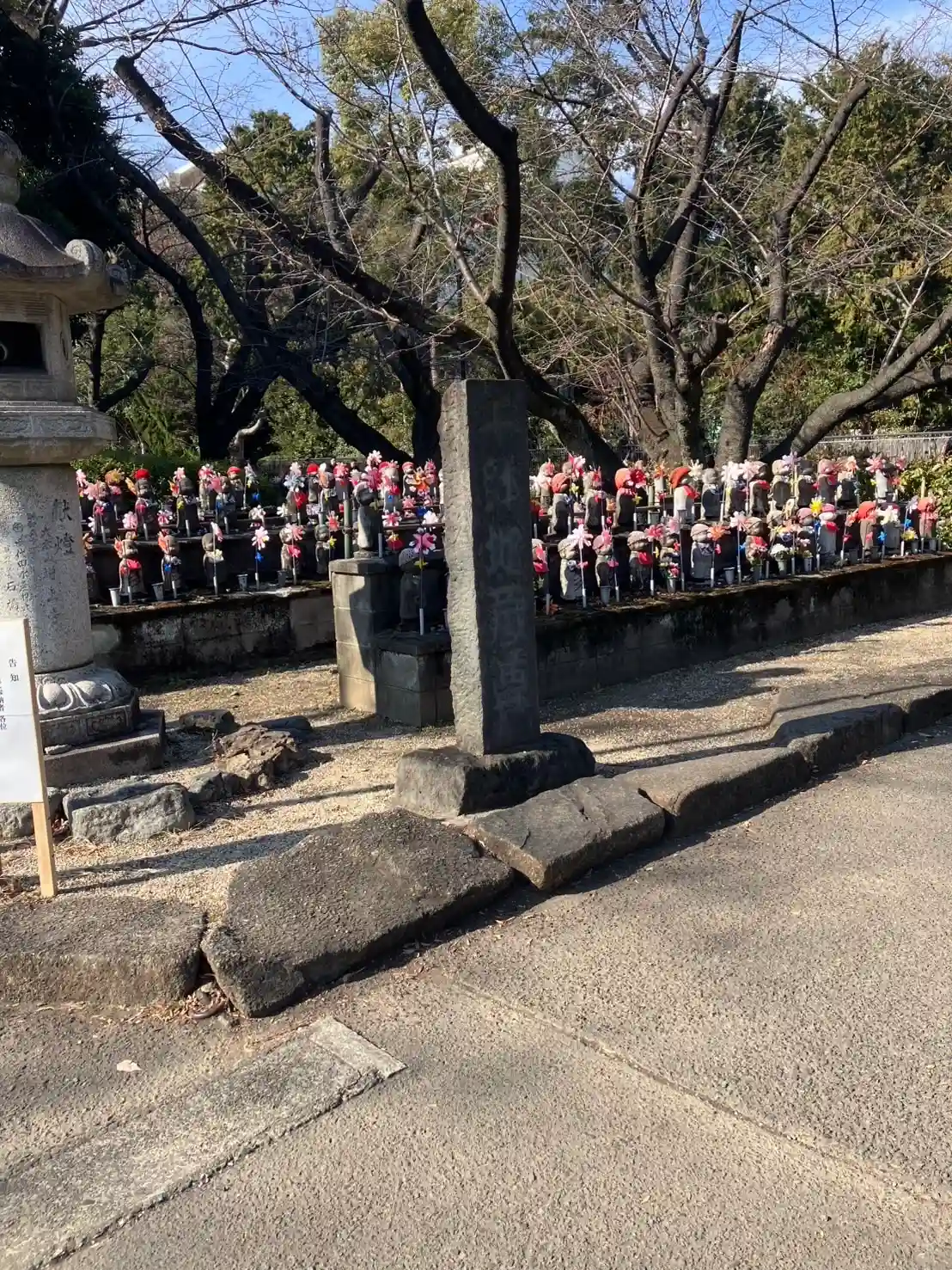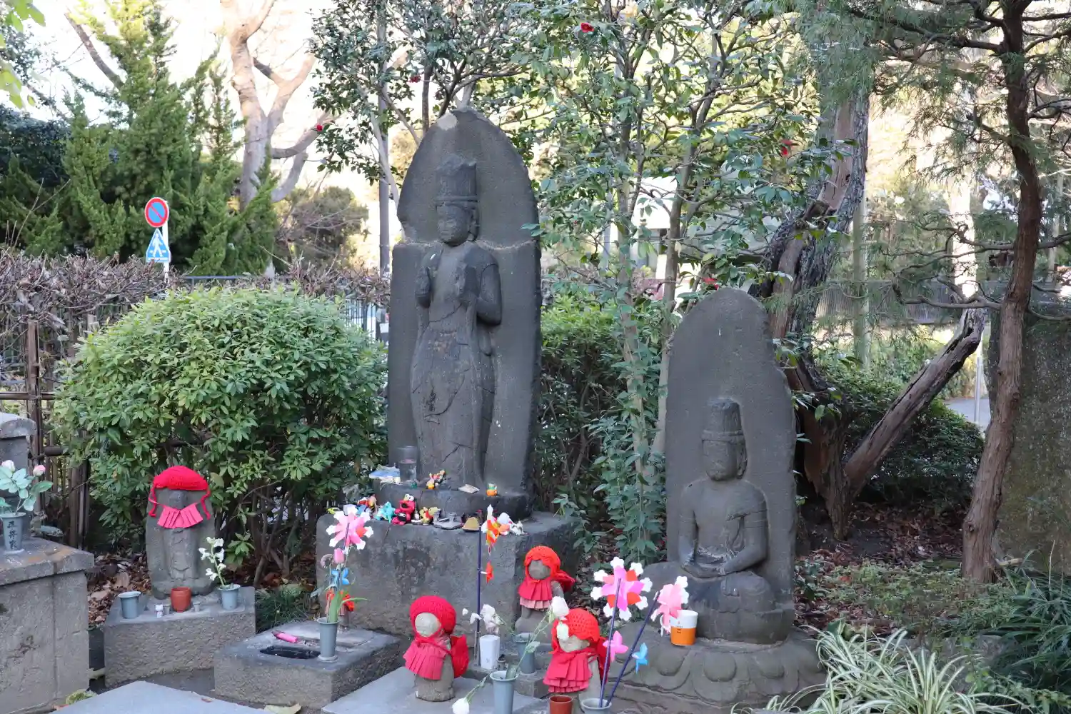 子供たちの健康と成長を願い祀られたのだそう。赤いニット帽とクルクル回る風車が賑やかで可愛らしい。