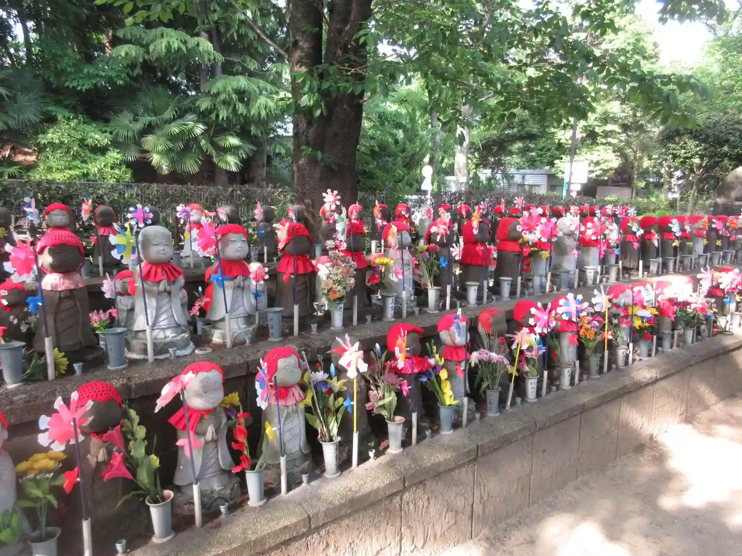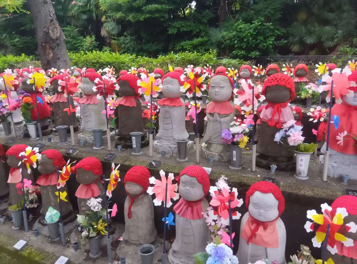 境内北側を大きく埋め尽くす<千躰子育地蔵菩薩>。当寺の<ひまわり講>が奉納。赤い帽子、赤い前掛け、風車が異なる。