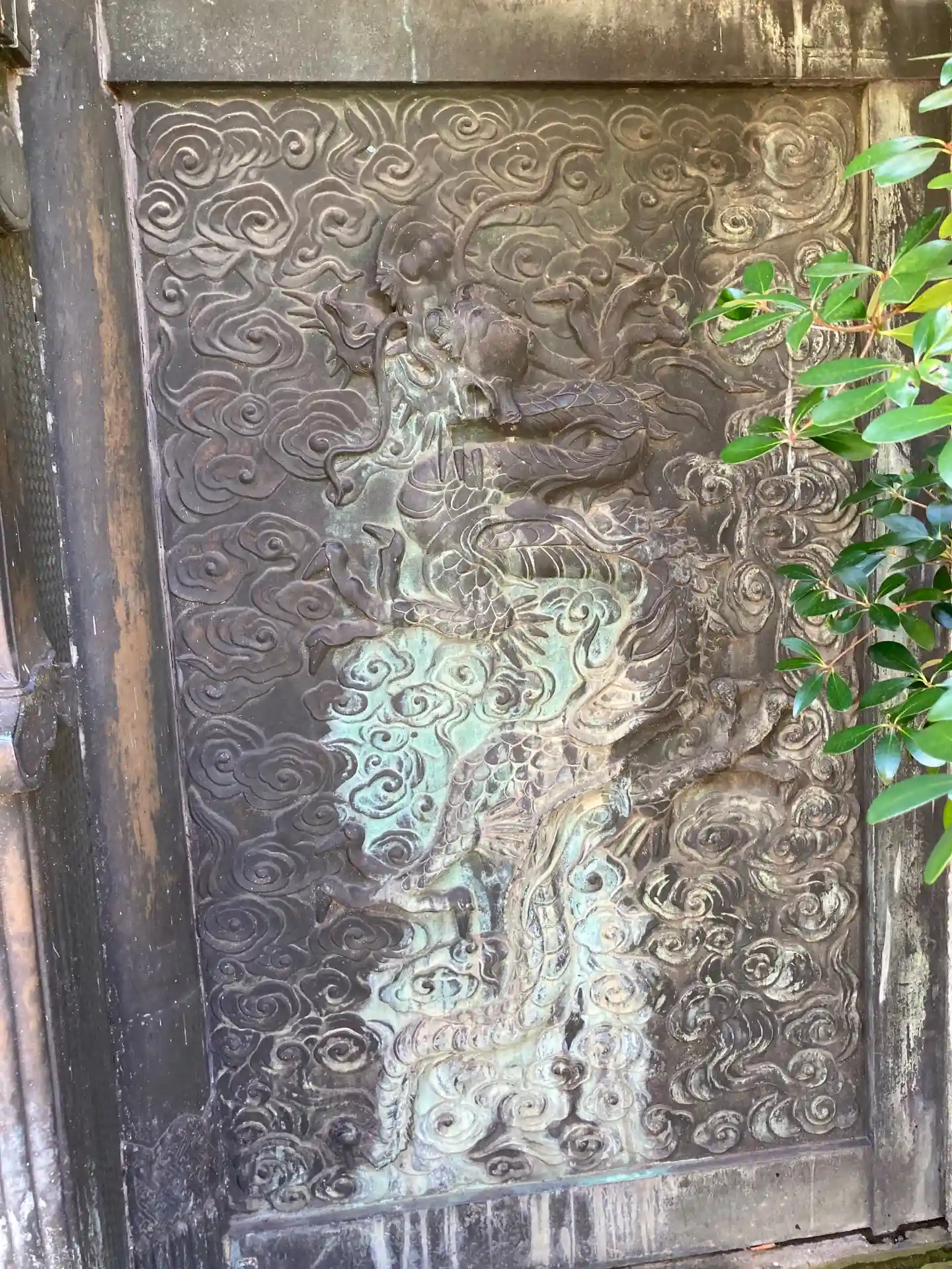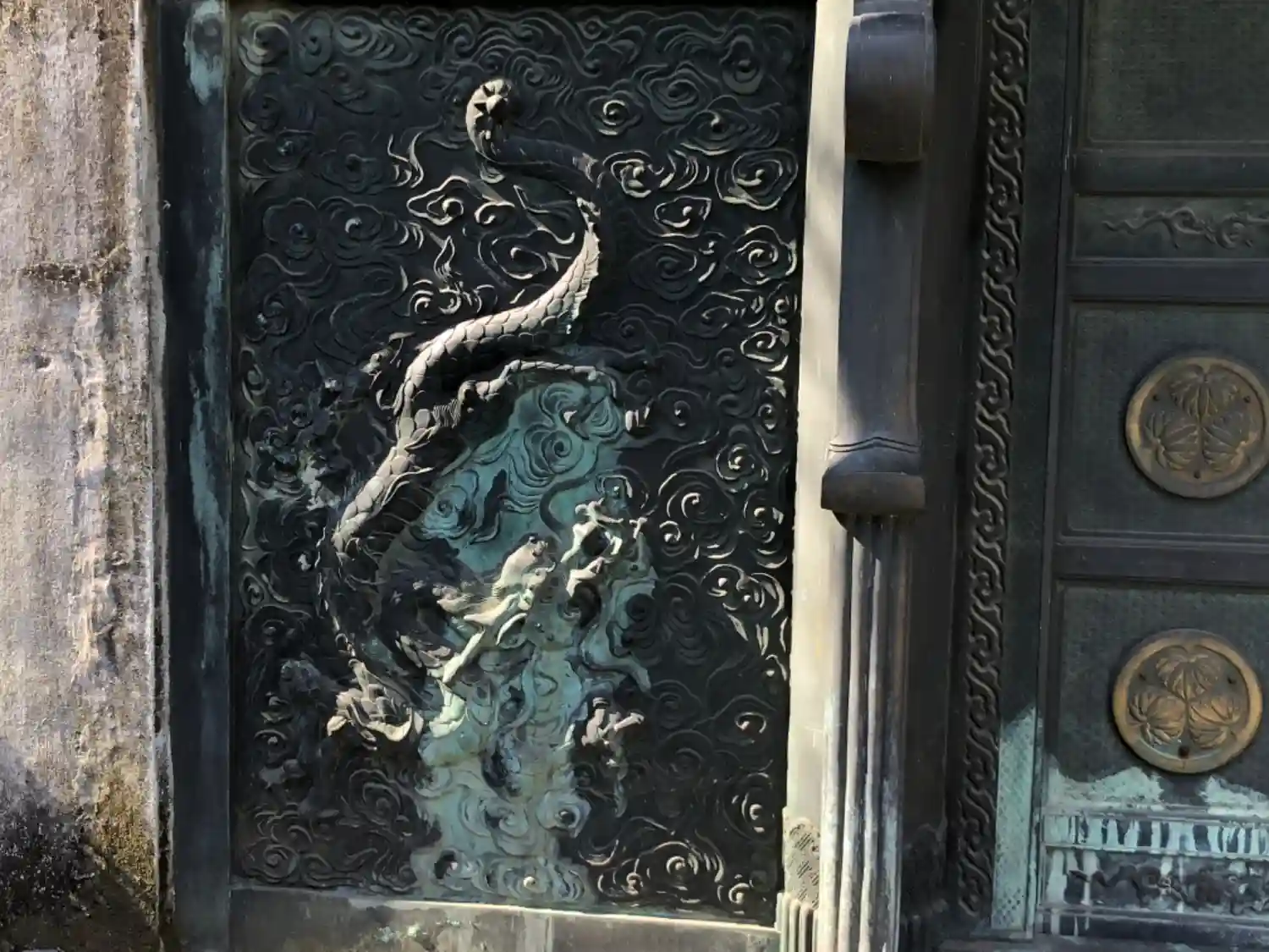 墓所入口に立つ門は6代将軍家宣霊廟の中門だったもの葵紋、昇り龍、下り龍が配されている