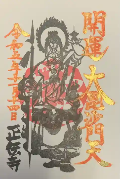 第7世住職の普明院日栄は摂津国島上郡梶原村の昌林山一乘寺の住職も兼任していた。一乘寺には、伝教大師最澄作で久遠成院日親が開眼したという毘沙門天像が2体あった。このうちの1体を当寺に移して安置した。この毘沙門天は評判を呼び、多くの参詣者が訪れた。特に初寅の日は大盛況であった。江戸時代は、まず最初に芝大神宮に詣で、次に当寺の門前で燧石を買う習わしがあったという。御朱印は隣の圓珠寺でいただけます。毘沙門天のかっこいい直書きです。
