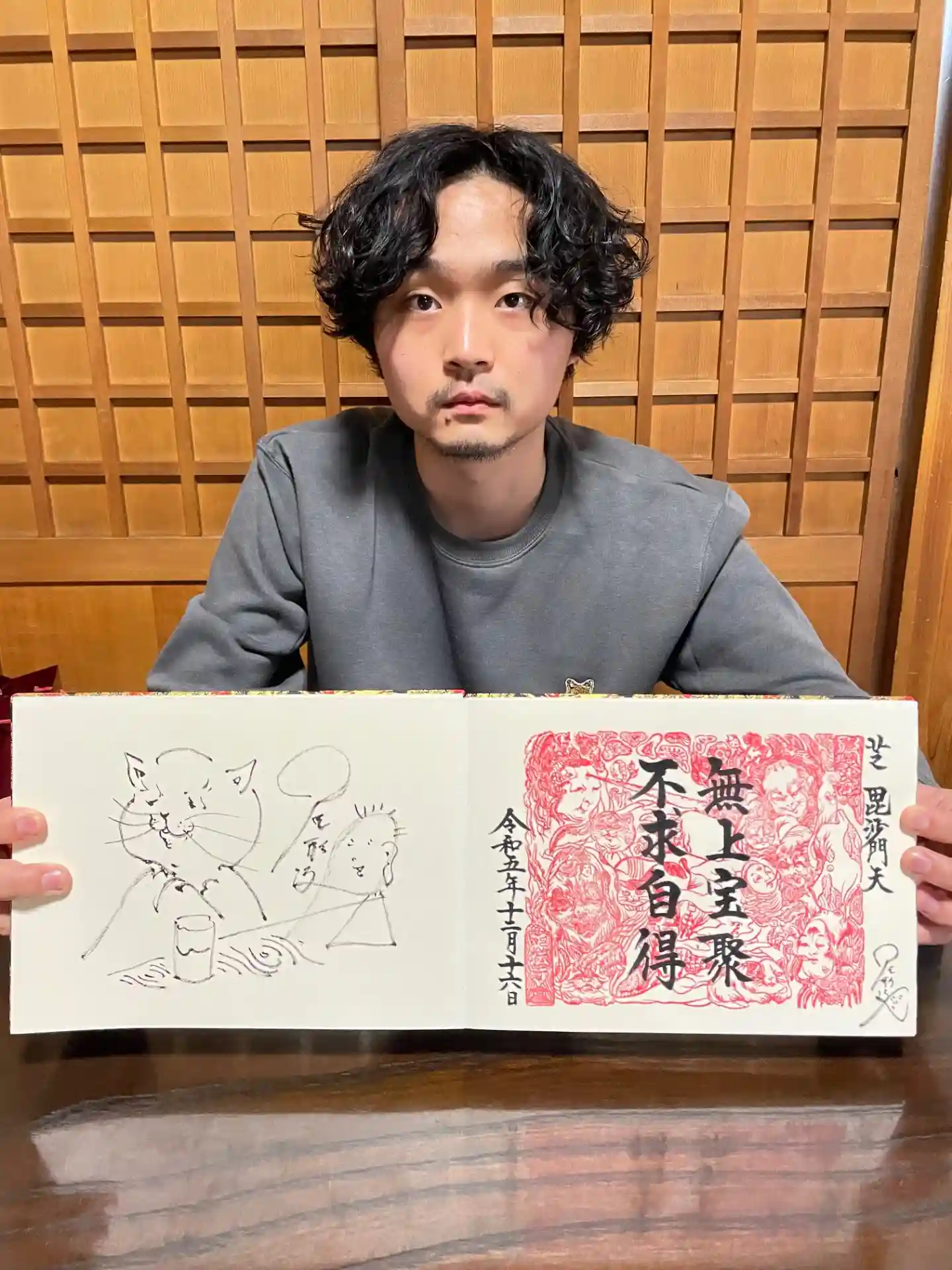 十界図御朱印シリーズも第七弾です。六道輪廻の地獄、餓鬼、畜生、修羅、人間、天上の次は四つの悟りの世界の一つ声聞界。声聞とは仏様の声を聞き、不退転の志を持って真理を探究し続ける求道者の世界。本日初日は、作者の藝大4年尾形凌さんから原画の説明とサインをいただきました。