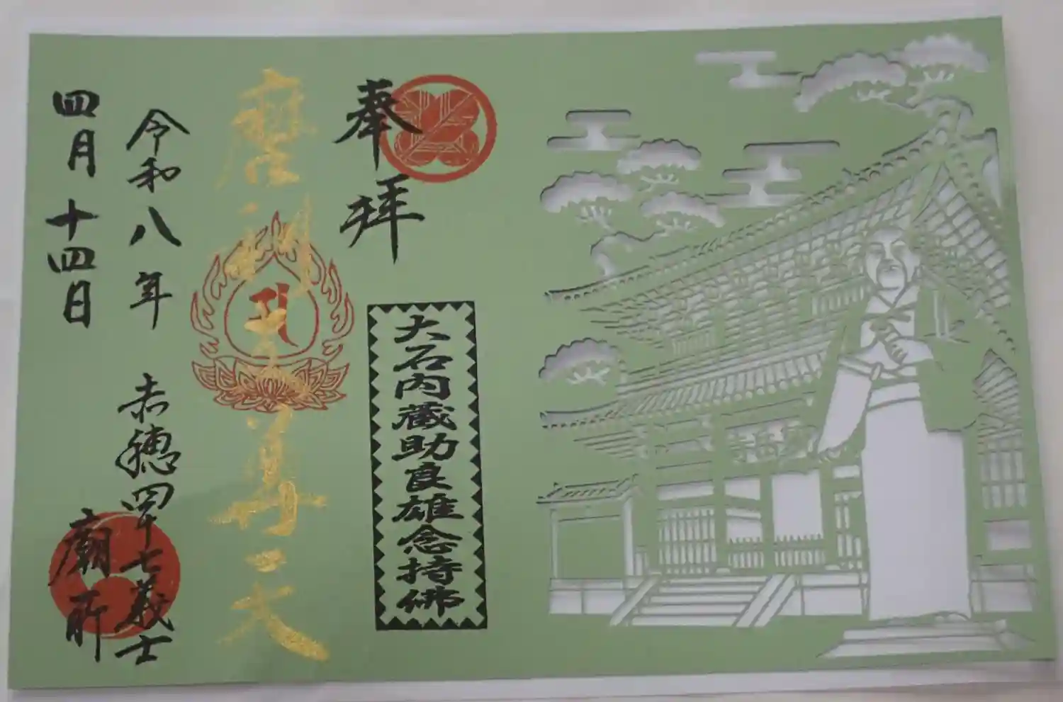 金色の地に、表面は赤穂義士がデザインされ、左上に納経帖の文字、裏面は真ん中に白色で大きく「義」の文字、右下に大石家の「右二つ巴」の家紋、左上に浅野家の「丸に違い鷹の羽」の家紋、左下に五三桐の寺紋と泉岳寺の文字が入っています。