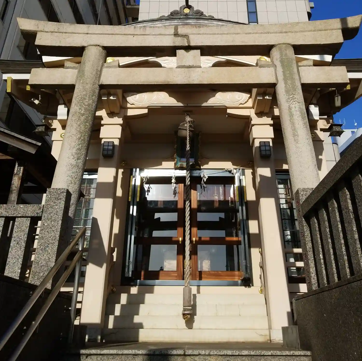 都営地下鉄浅草線、泉岳寺駅近くの交差点で、ビルの上に神社を発見し参拝しました。
