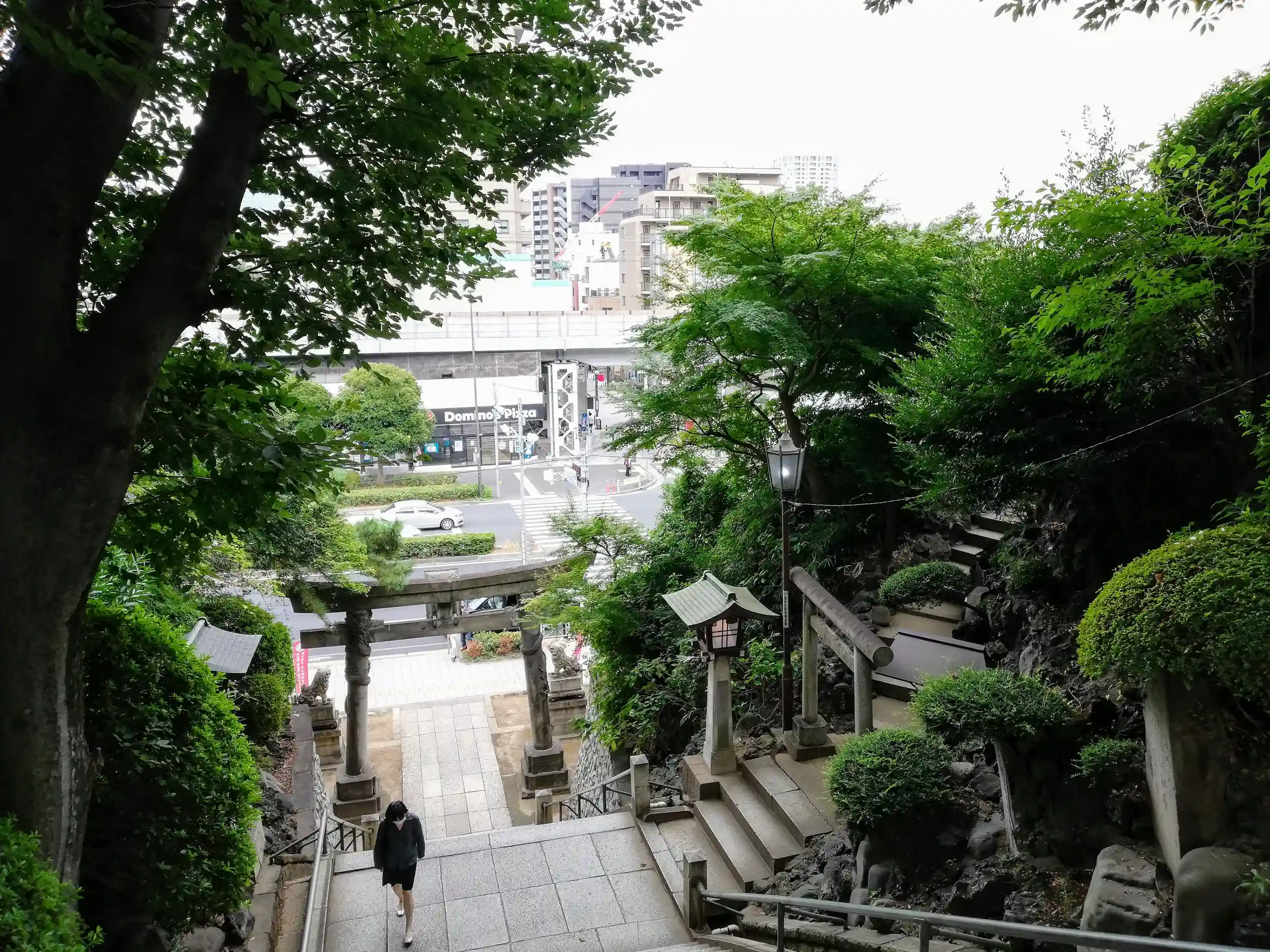 参道階段より第一京浜をのぞむ。結構急で長い階段が続きます。脇に伸びる階段は富士塚へとつづきます。ここは後回しにしてとりあえず社殿を目指します。