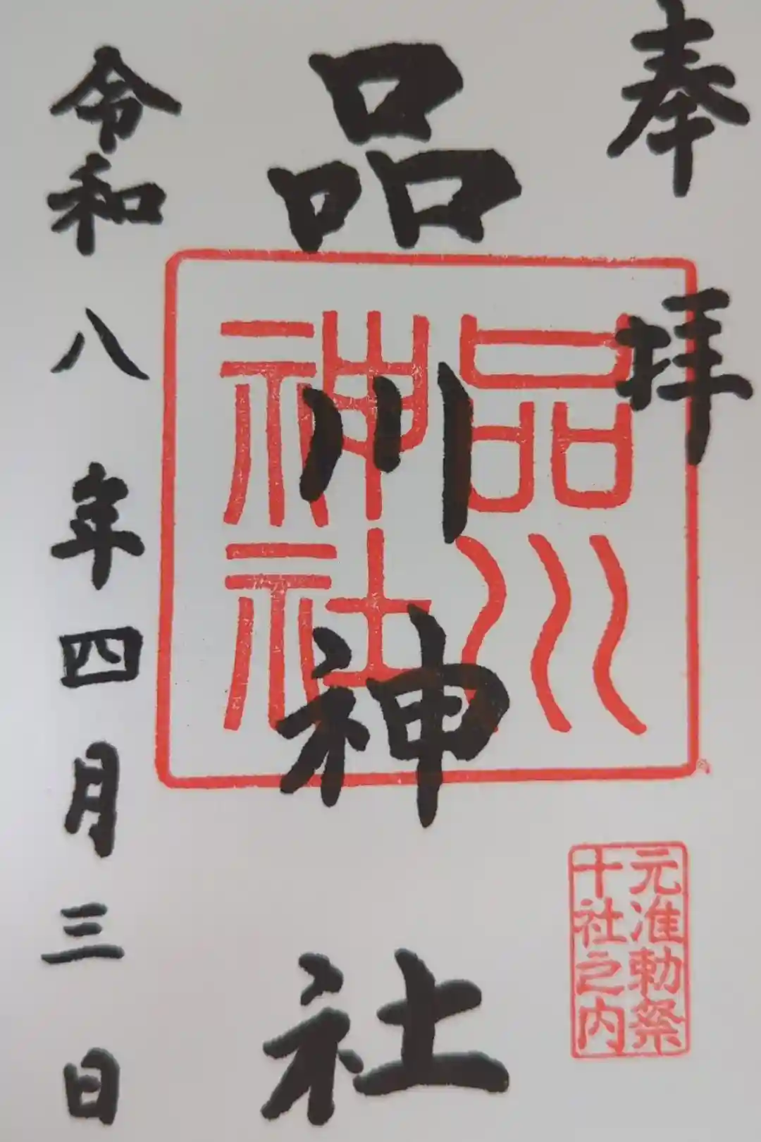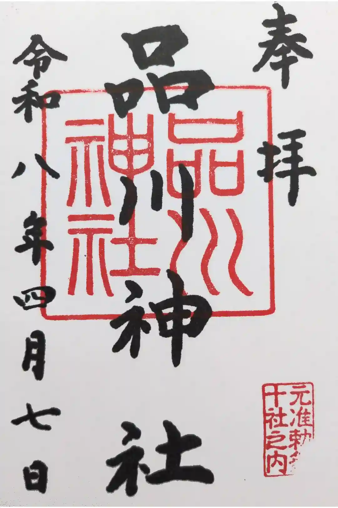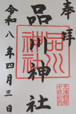 左側に日付と「品川神社」の墨書きと神社印が押されています。