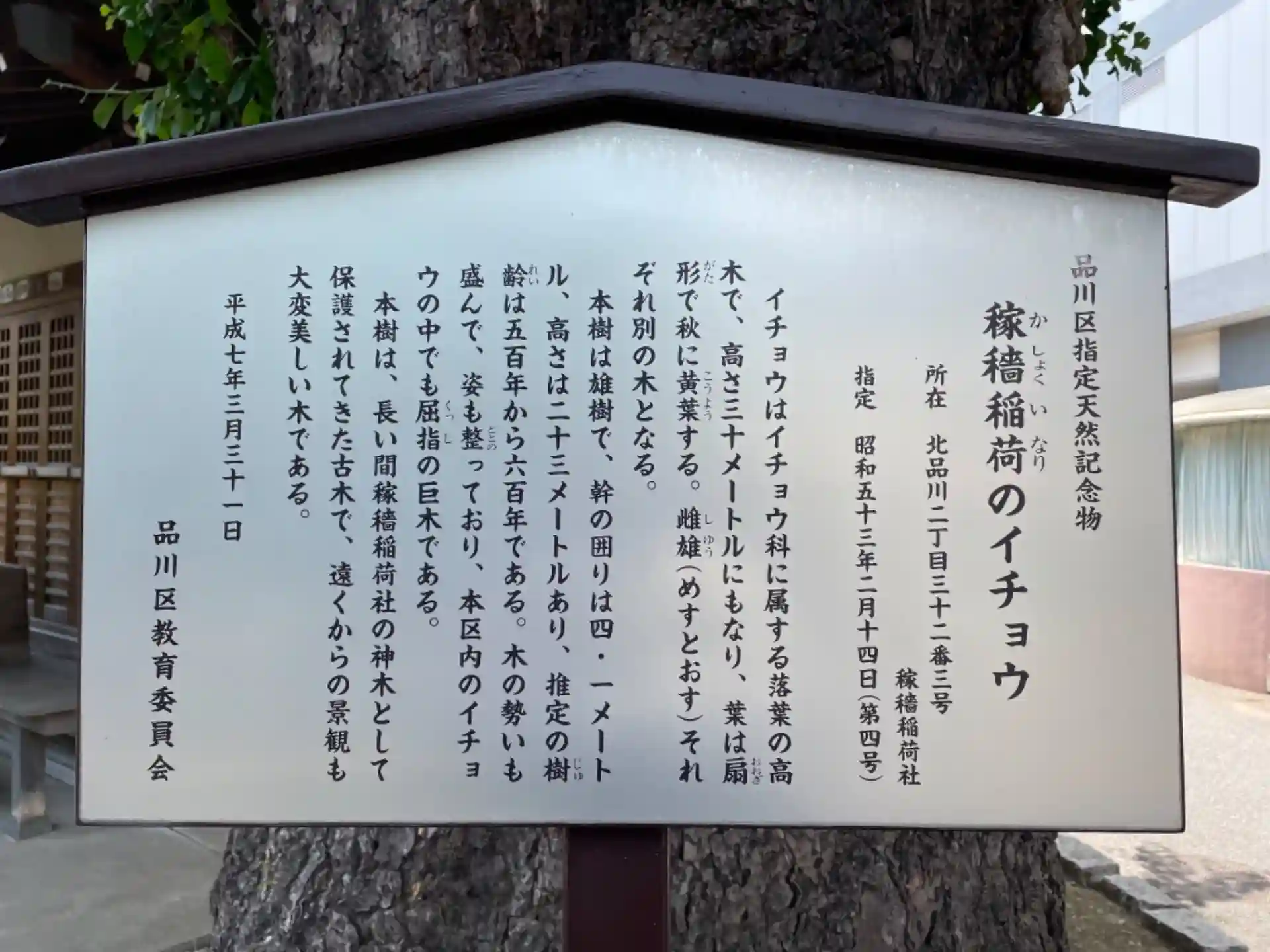小さなごく普通のお稲荷さん稼穡稲荷社。しかし、ここにある大イチョウは品川区でも最大級のものです、説明によると幹の周りは4.1メートル高さは23メートル推定樹齢は500年から600年。長い歴史を感じさせ樹皮の一部がが垂れ下がるも、枝葉に勢いがあり、老木というより勇姿です。