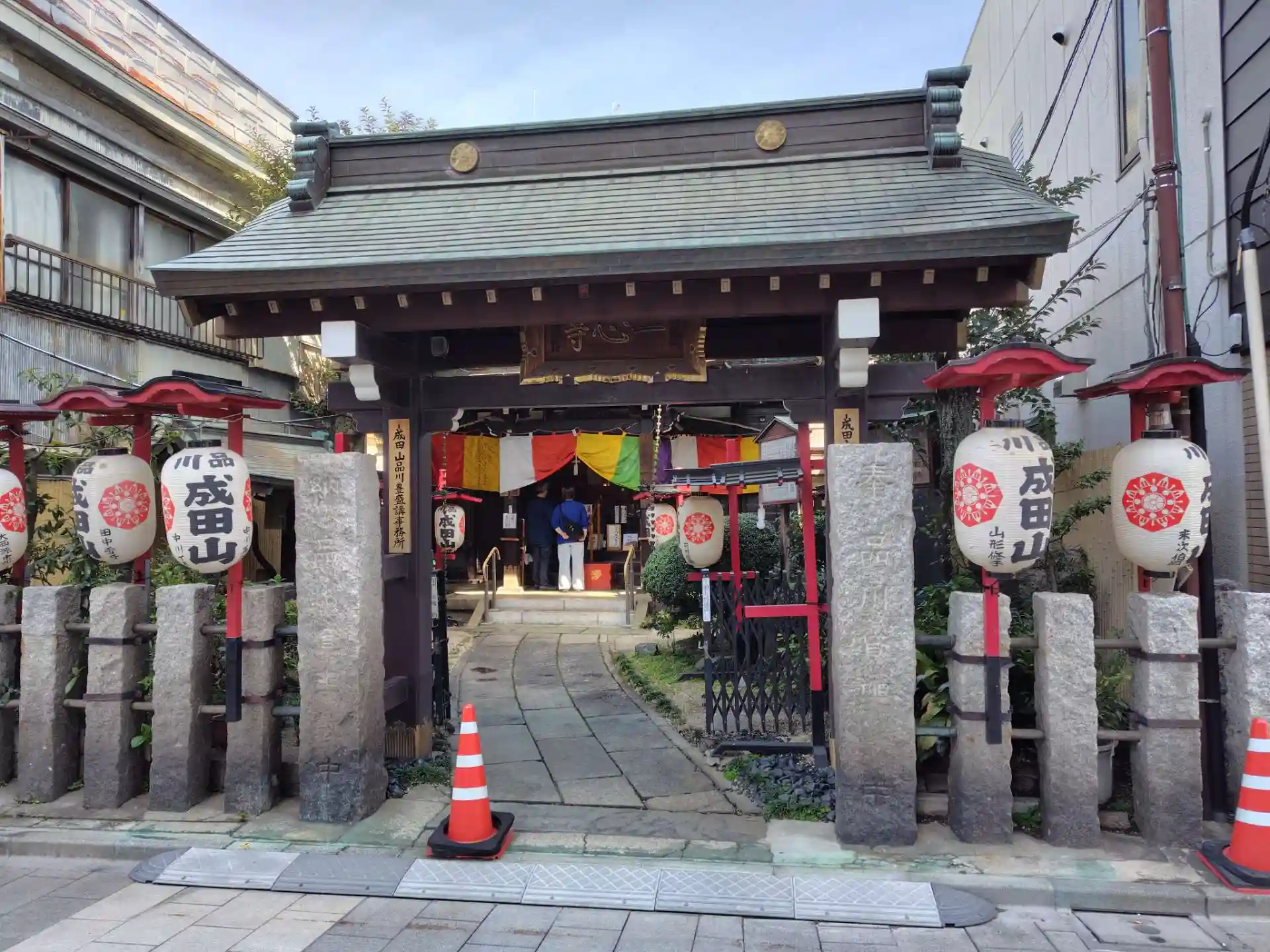 高輪神社を出て、大改造工事中の品川駅を横目に歩きますと、ここも大改造を控えた八ツ山橋。橋を渡る京急線を見送って、いよいよ旧東海道。数分歩いて東側に成田山の提灯が目に止まり、参詣しました。