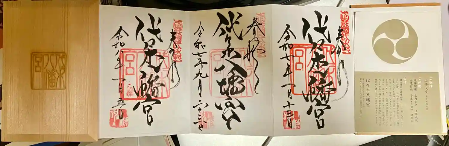 真ん中に代々木八幡宮と書かれ、右上に武蔵國代々木野の印、真ん中に代々木八幡宮の印、左下に八幡神の印が押されています。