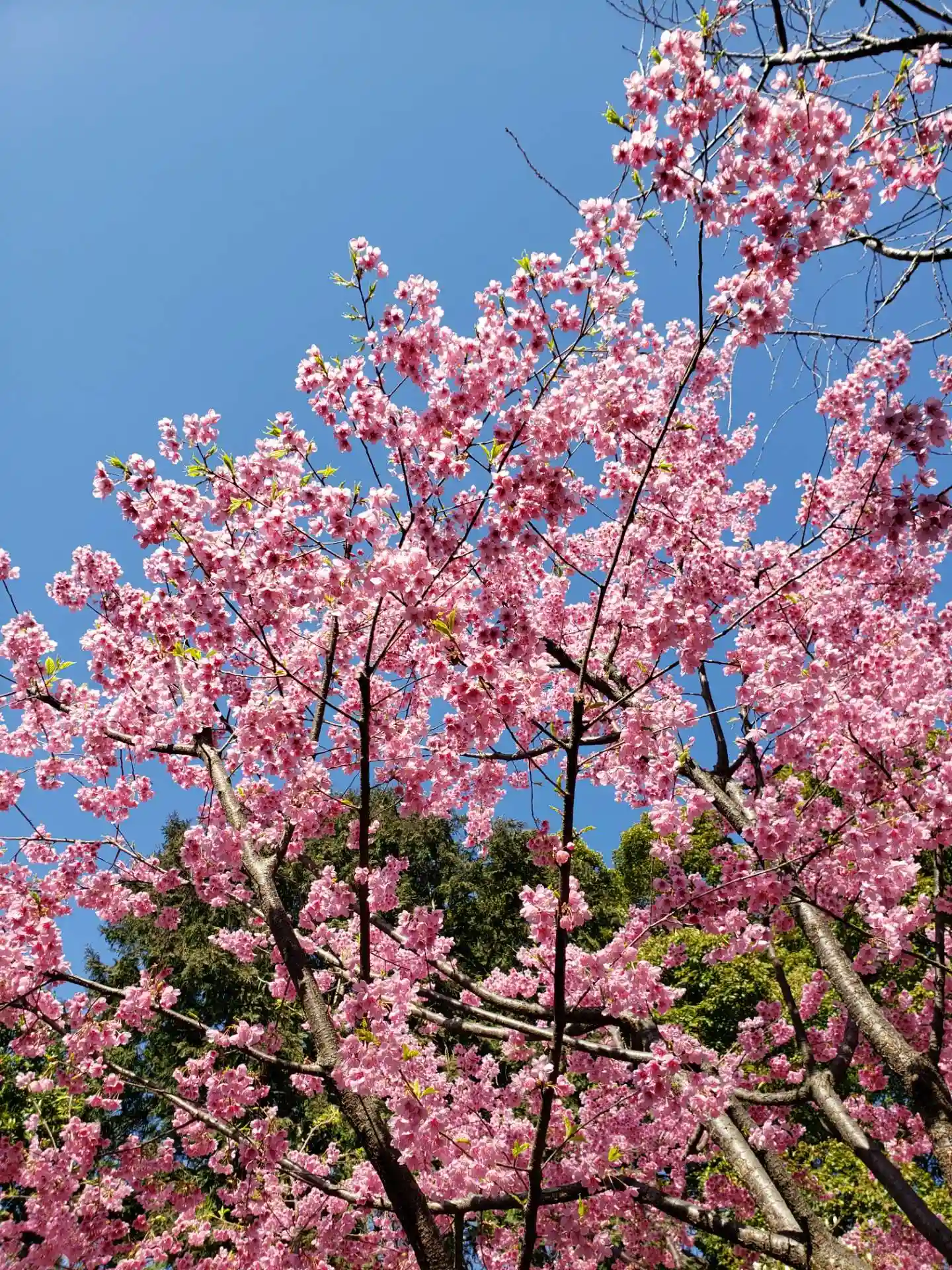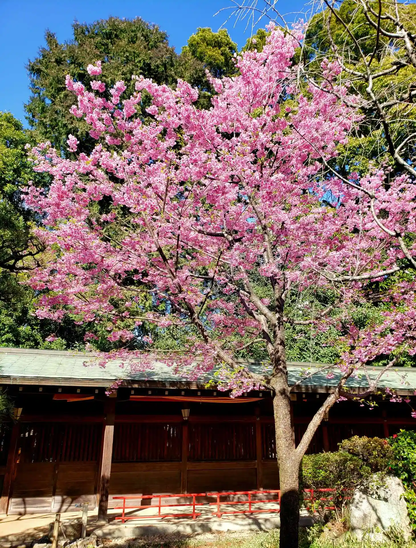 社殿と左手の社務所の奥、参集殿との回廊前にある、紅枝垂れ桜が満開でした。濃いめのピンクで可愛いですが、少しづつ葉が出ていたので、ギリギリ満開を楽しめました。