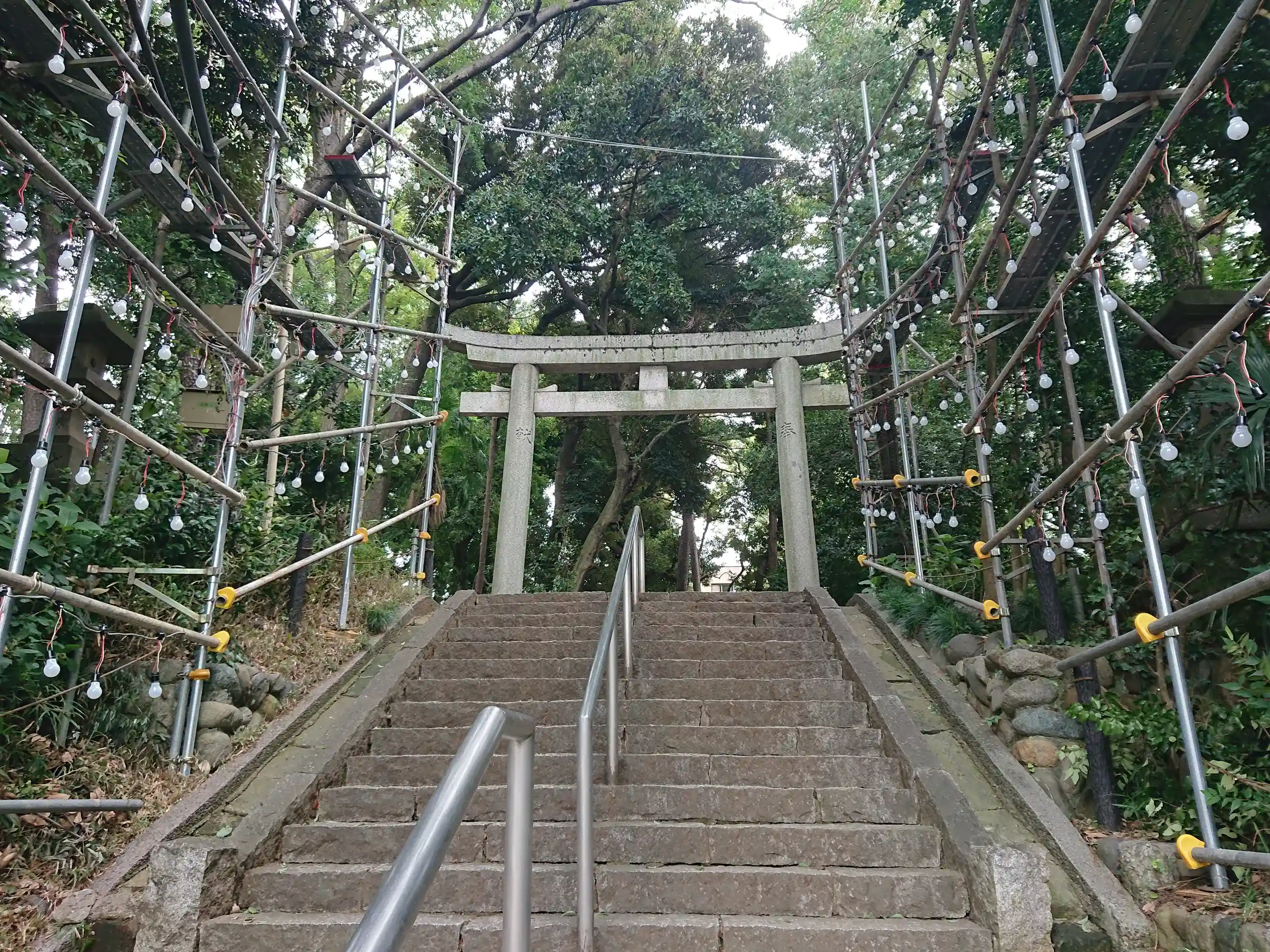鳥居の周りは鉄パイプで固められているため「ここも改修工事中?」と