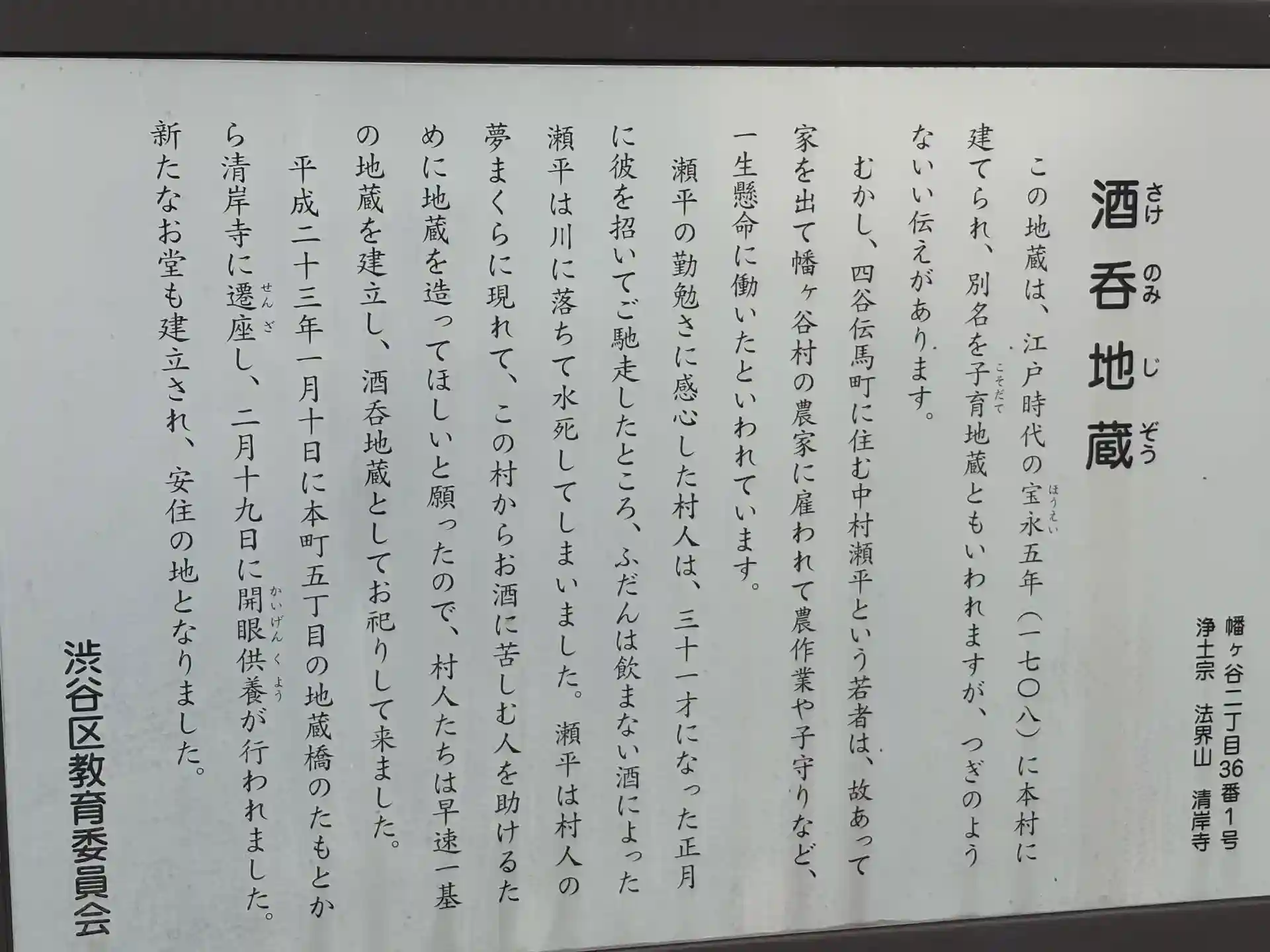 ふだん飲まない酒に酔って水死してしまった中村瀬平と言う勤勉な若者が、村人の枕元に現れ、この村からお酒によって苦しむ人を助けるために地蔵を造って欲しいとの願いから建立されたとの事です😢