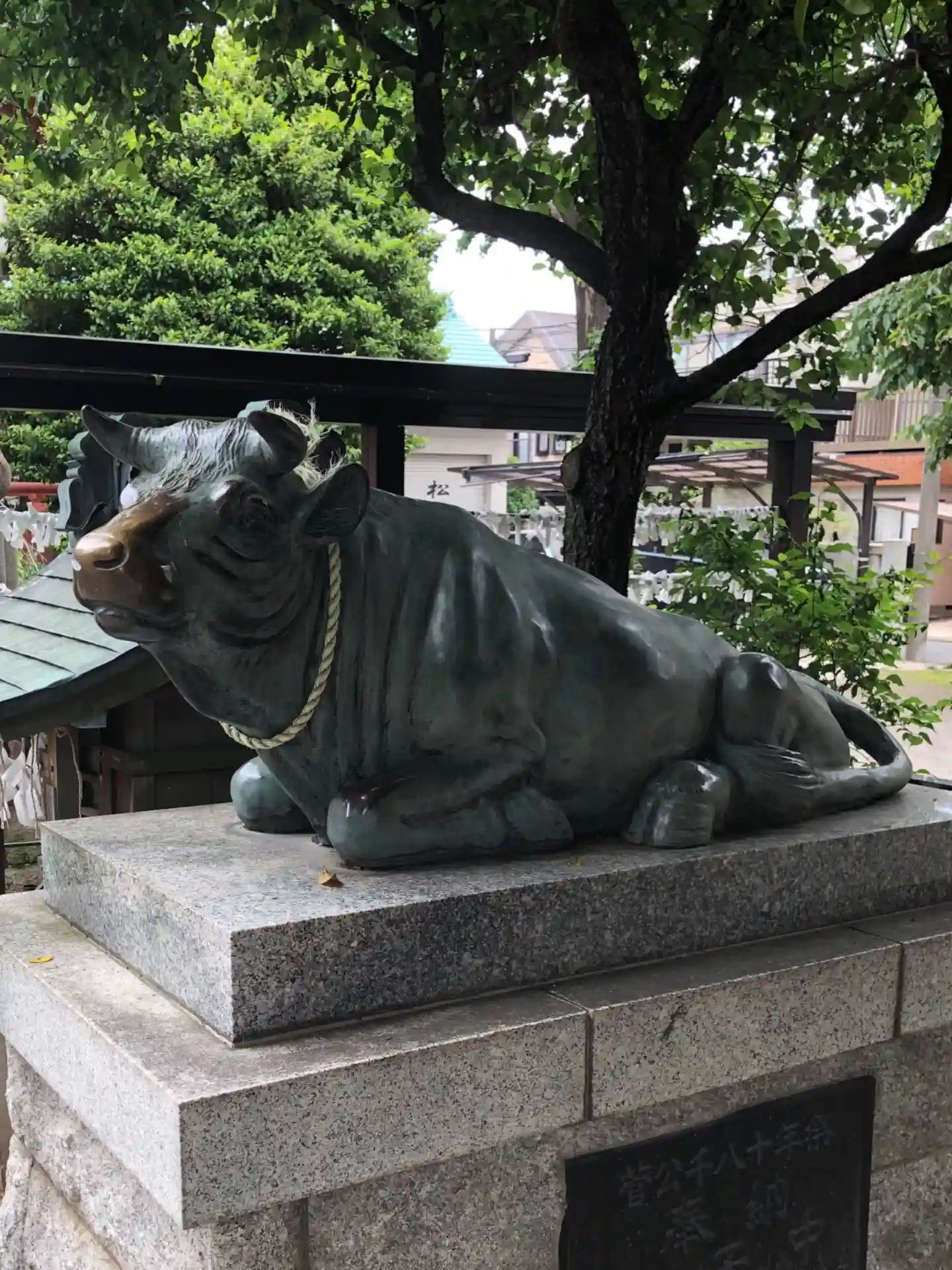 撫で牛像脇の小祠は、氏子の邸内から遷された大黒・恵比寿社。