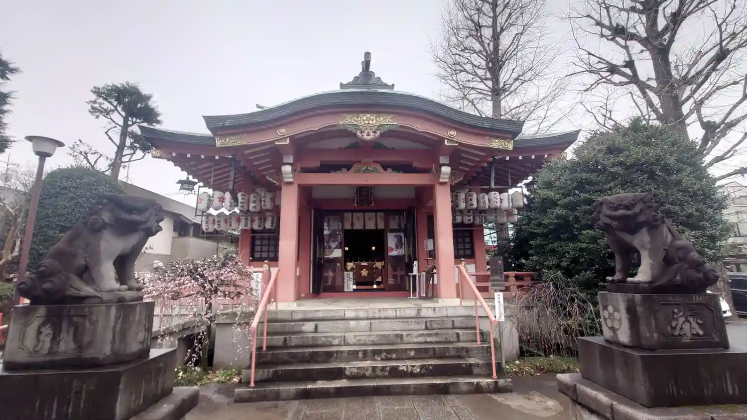 朱塗りの社殿や弁天池と…