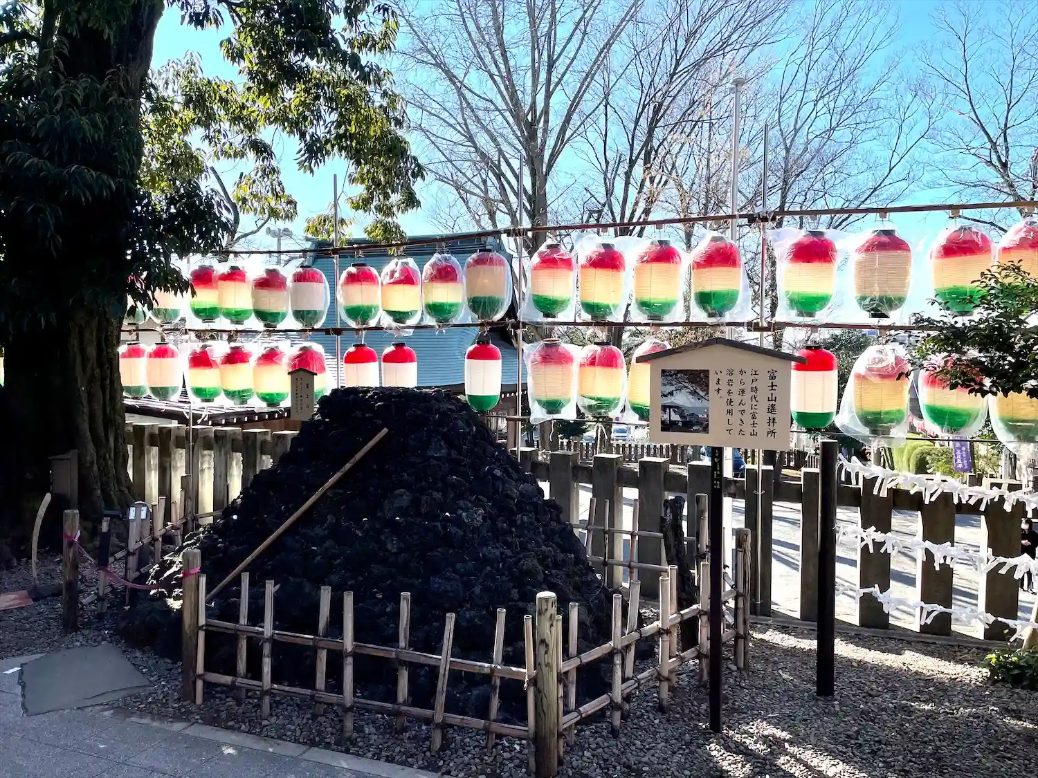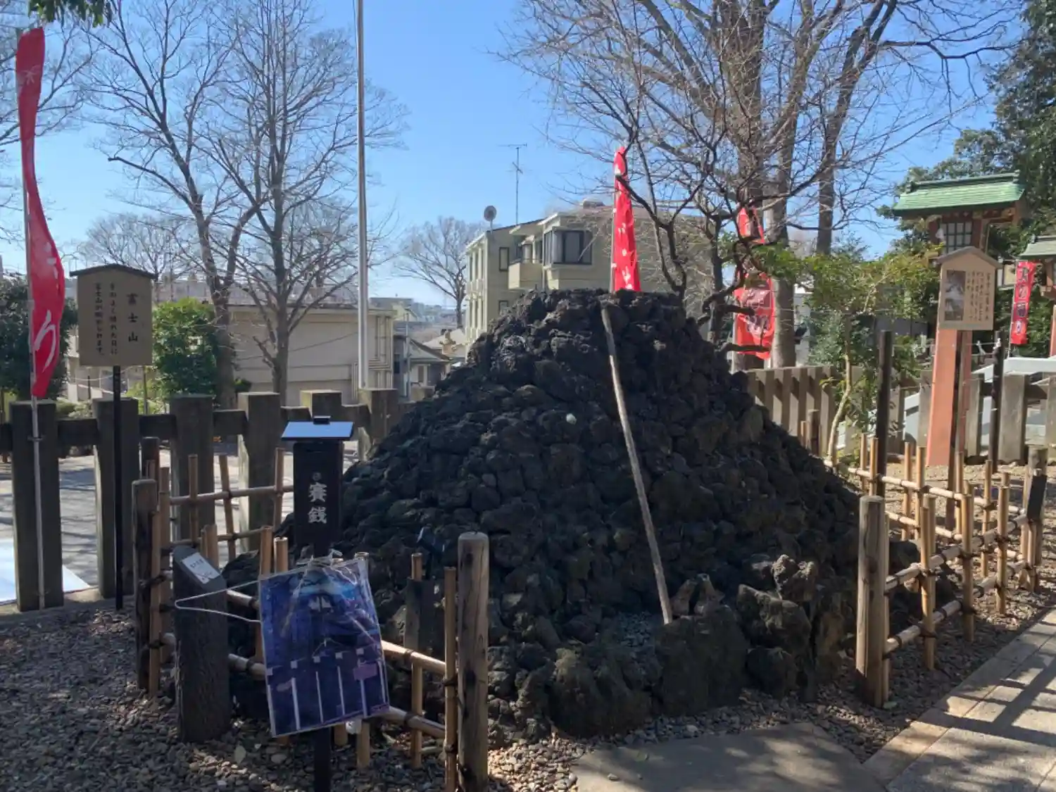 富士塚もあり、晴れていると富士塚越しに富士山が見え…