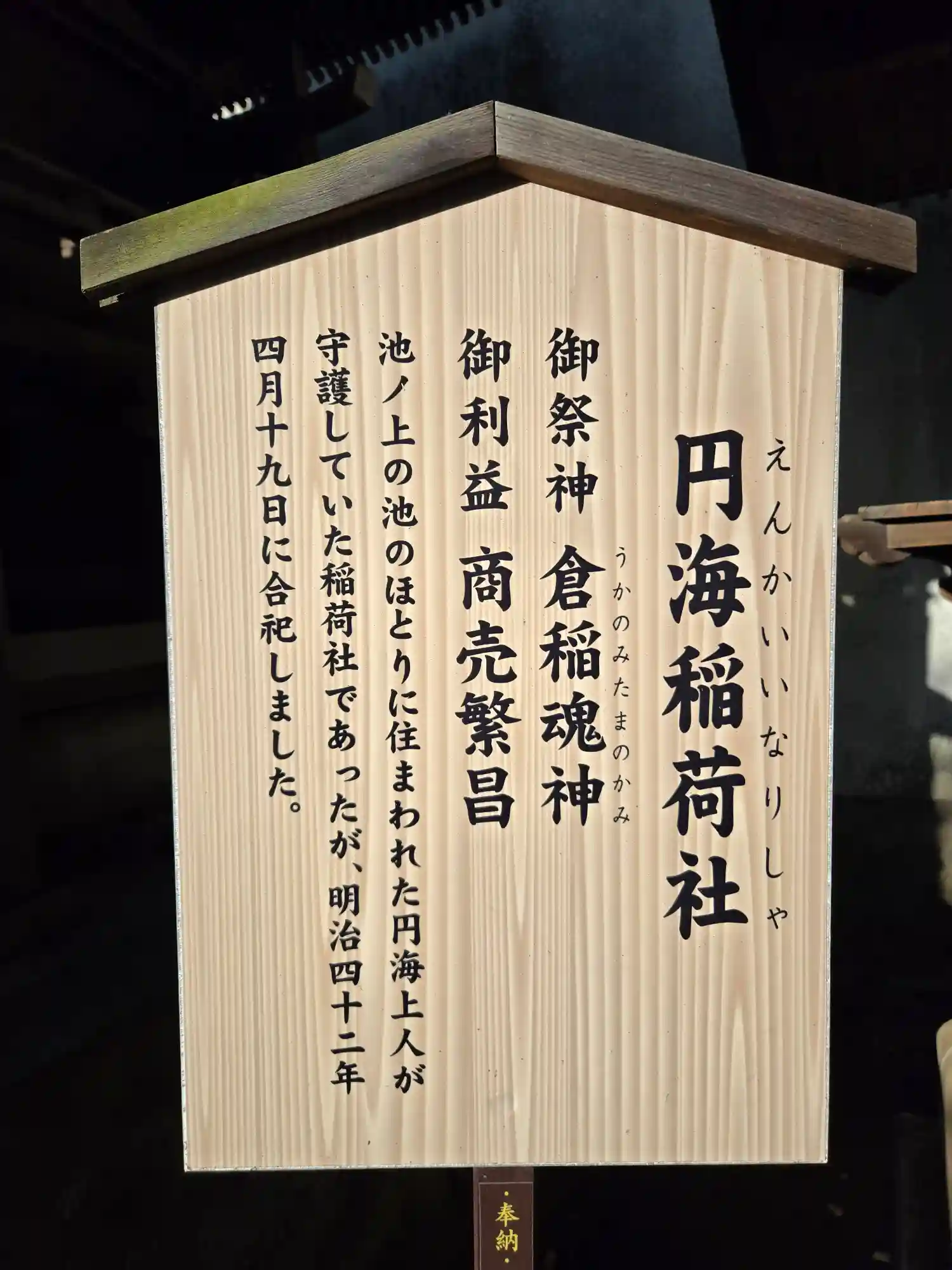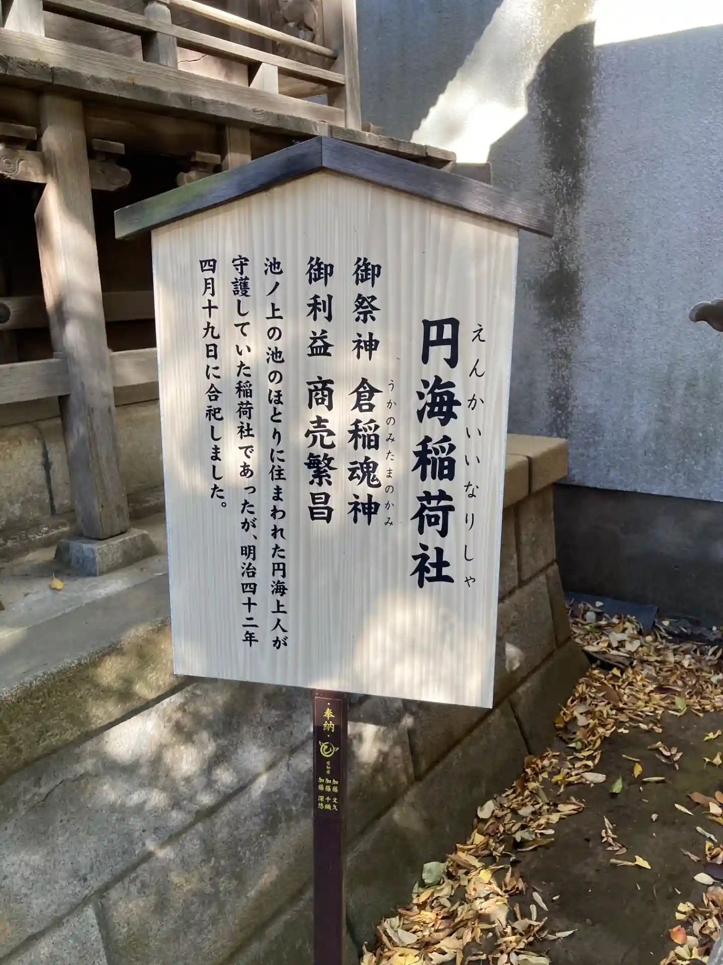 池ノ上の池のほとりに住まわれた円海上人が守護していた稲荷社ですが、明治42年4月19日に合祀しました🦊