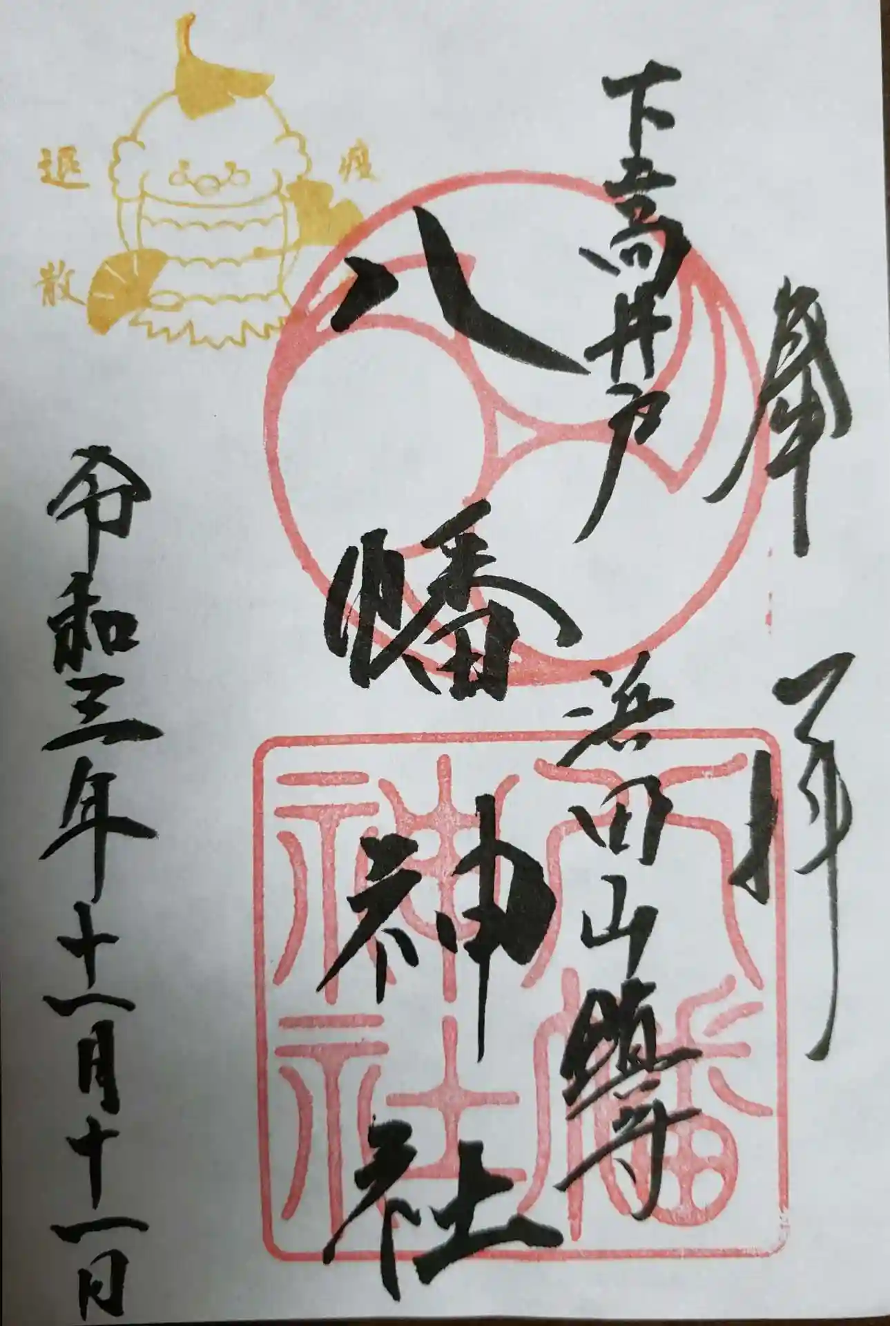 普段の御朱印に、期間限定で、左上にアマビエに銀杏の模様をあしらったものを押してあります。