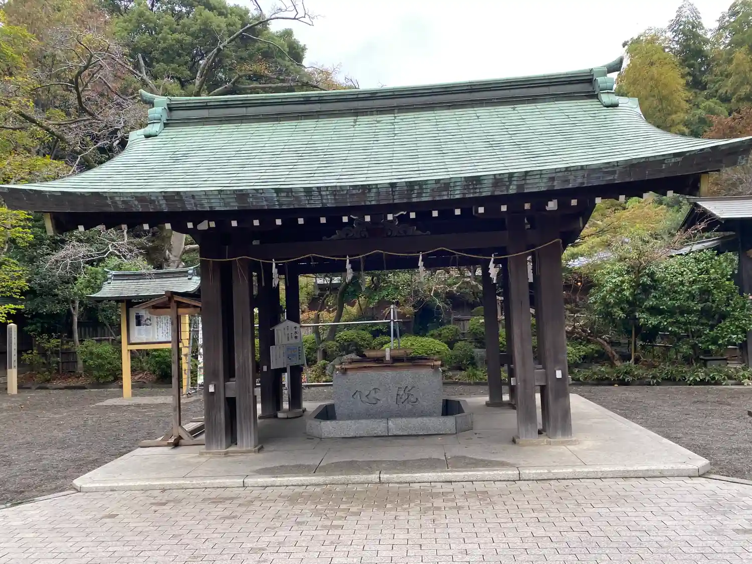 神域入口付近、斜めから。左に見える屋根が<神門>、右に見える屋根が<手水舎>。