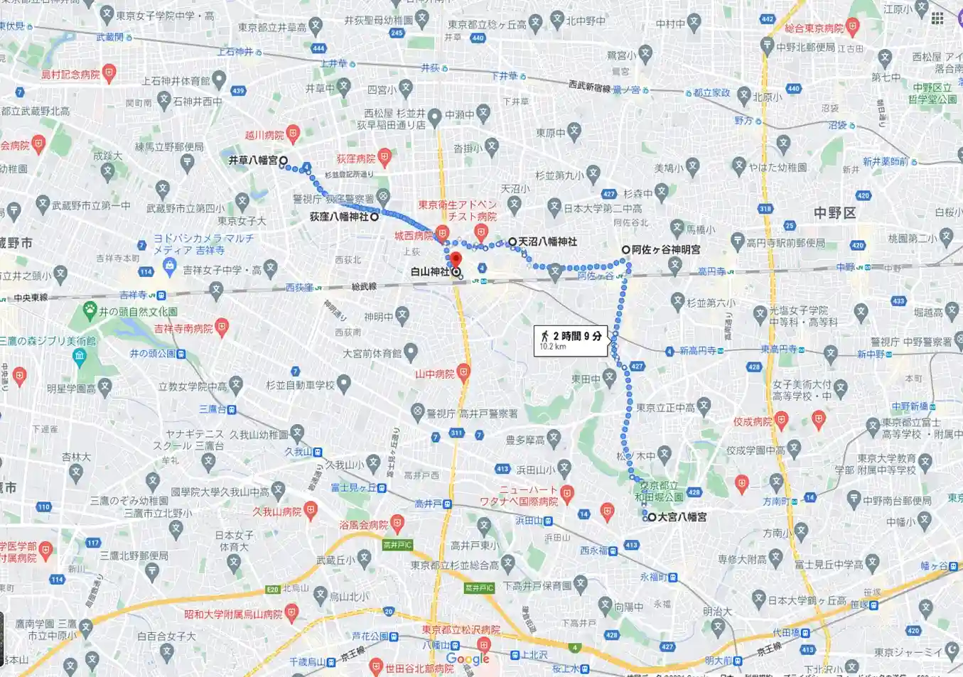 家から、永福町の大勝軒(ラーメン屋さん)まで徒歩15分、さらに15…
