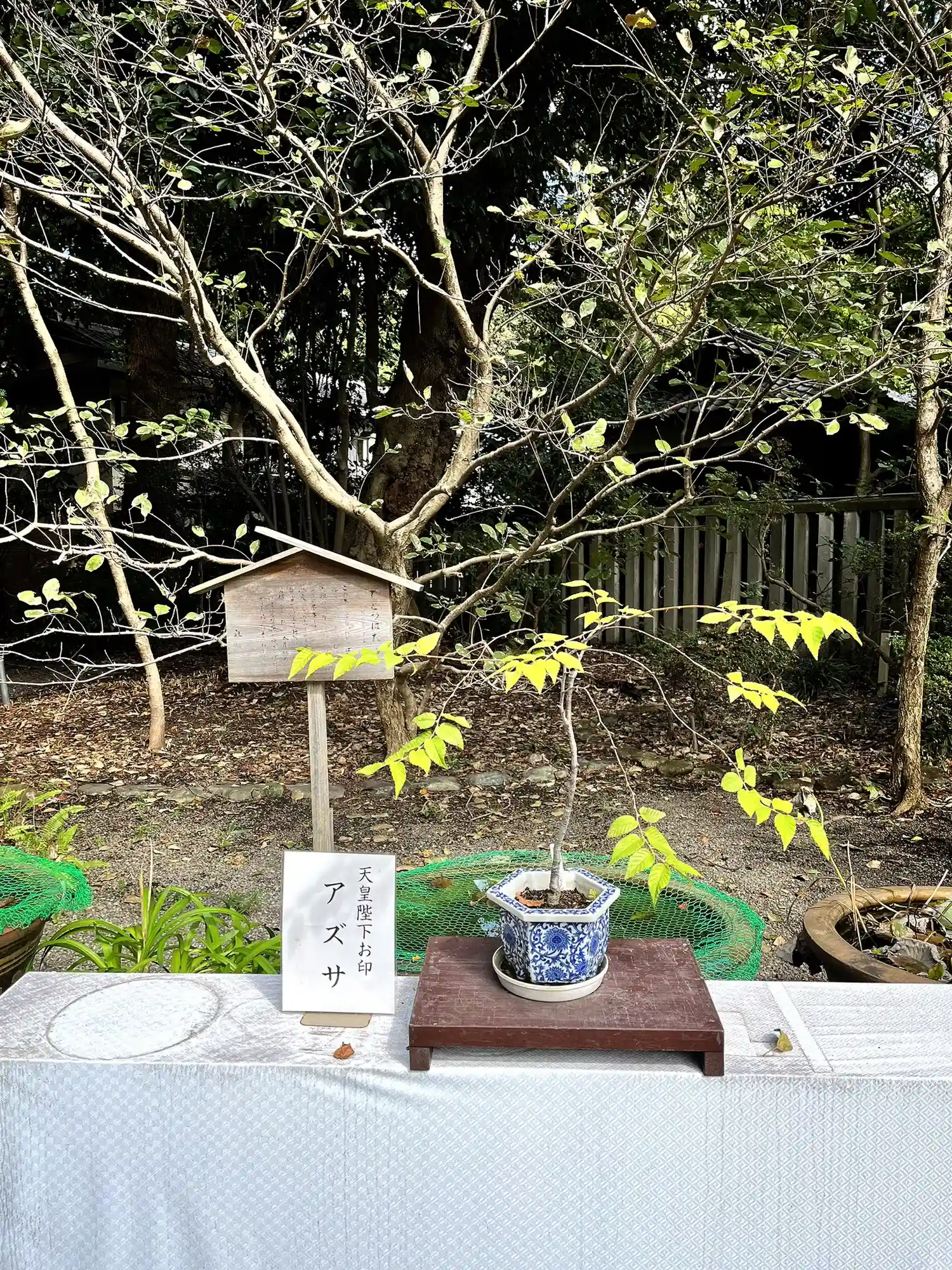 本殿前に戻り、境内で催されていたつつじの盆栽展を拝観。
