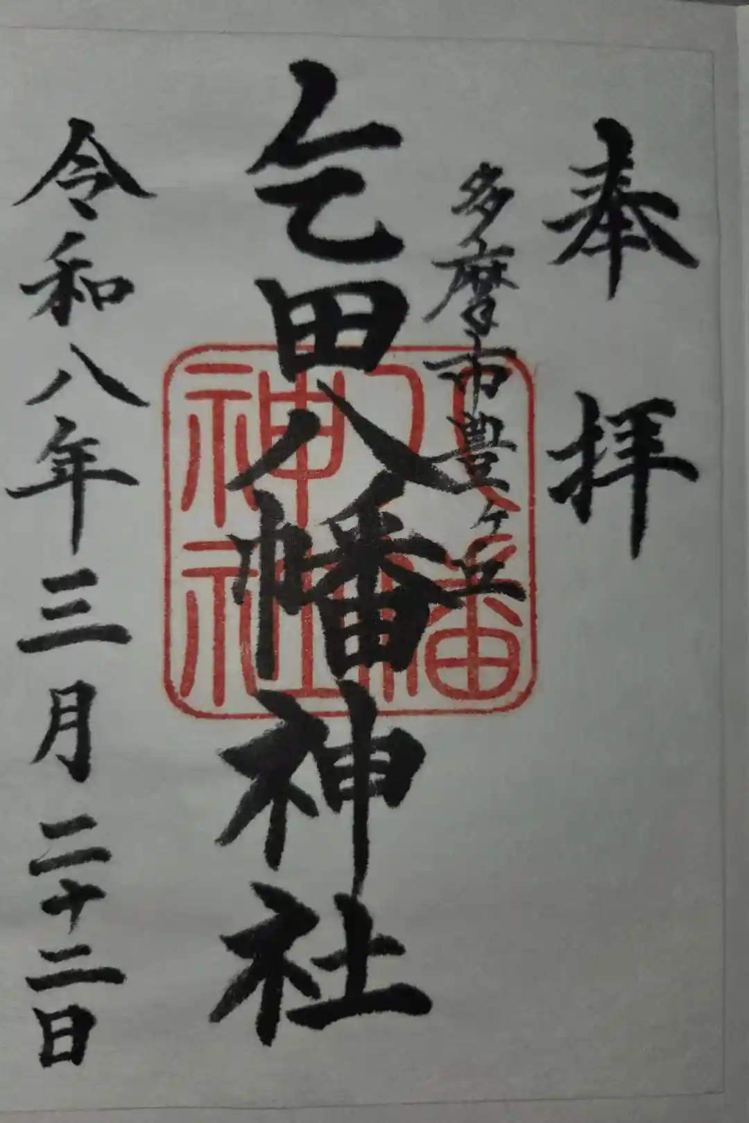本日,乞田八幡神社様の書き置きの御朱印を頂きました。