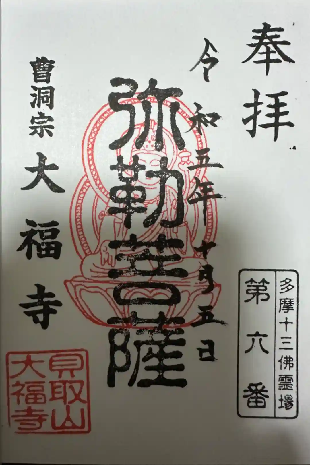 直書きを拝受。多摩十三佛霊場第六番。他の同霊場は書置きスタンプが多い中、直書きでいただき感激です。ご丁寧にペットボトルのお茶までいただきました。ありがとうございました。