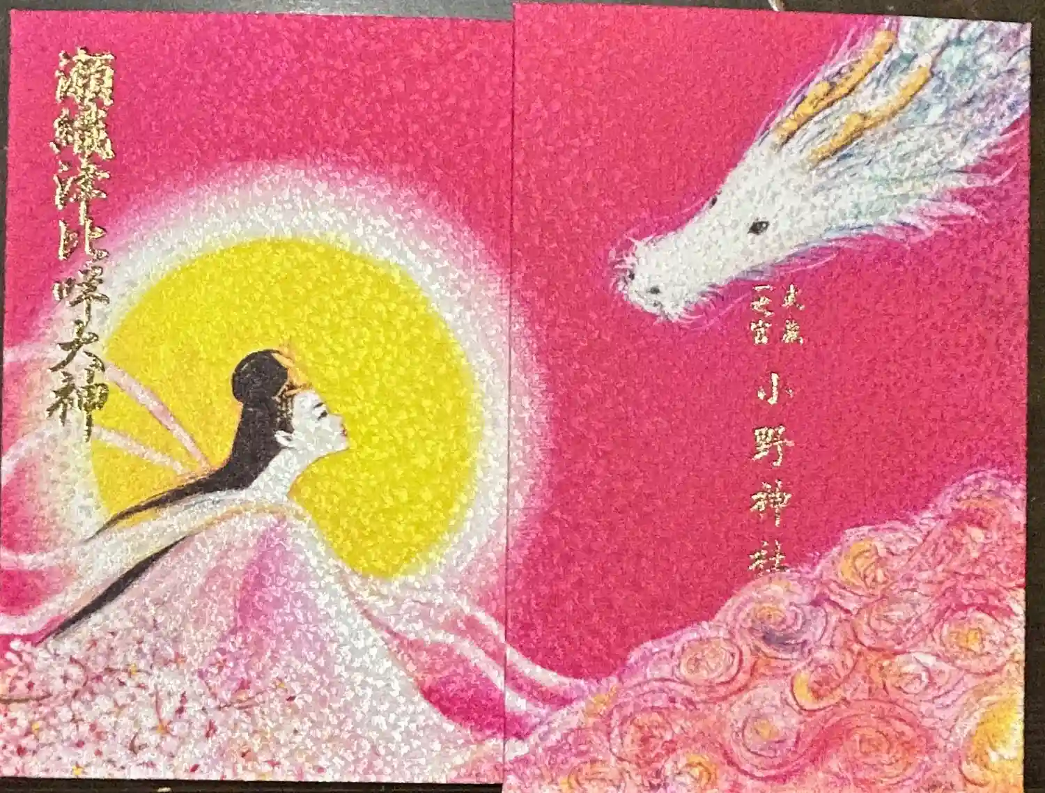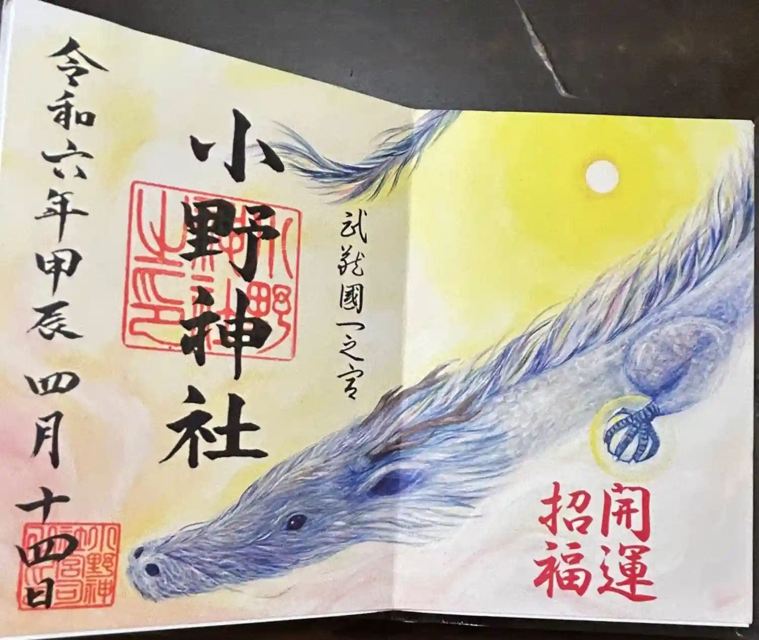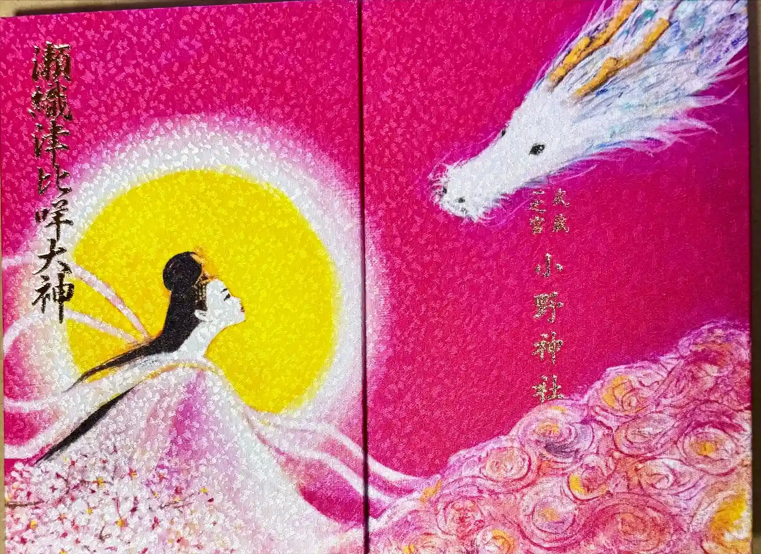 天下春命、瀬織津比咩命を主神とする神社です。宮司の奥様がデザインしたという御朱印帳。瀬織津比咩命と化身と言われる龍神(白龍)が載っています。