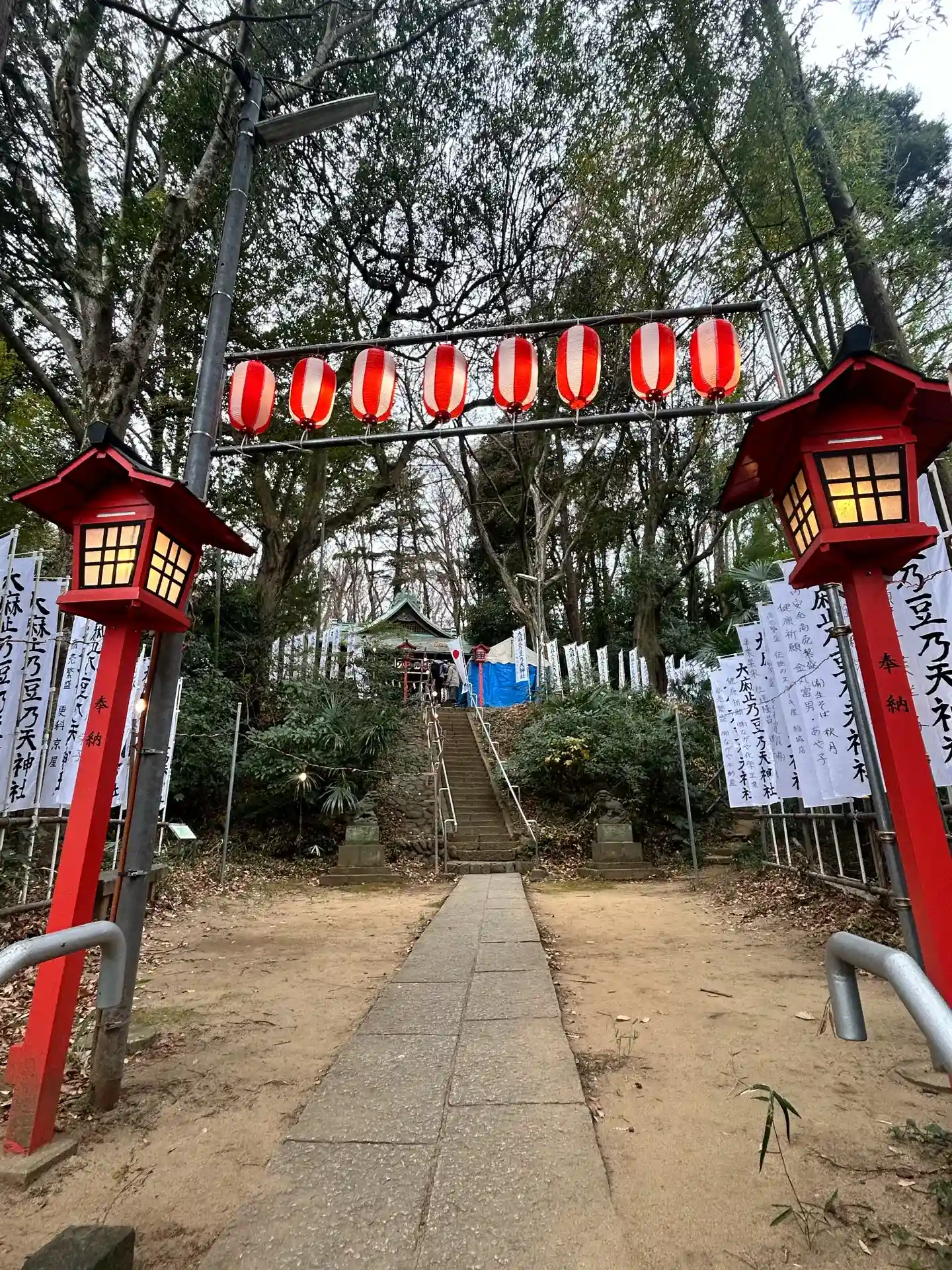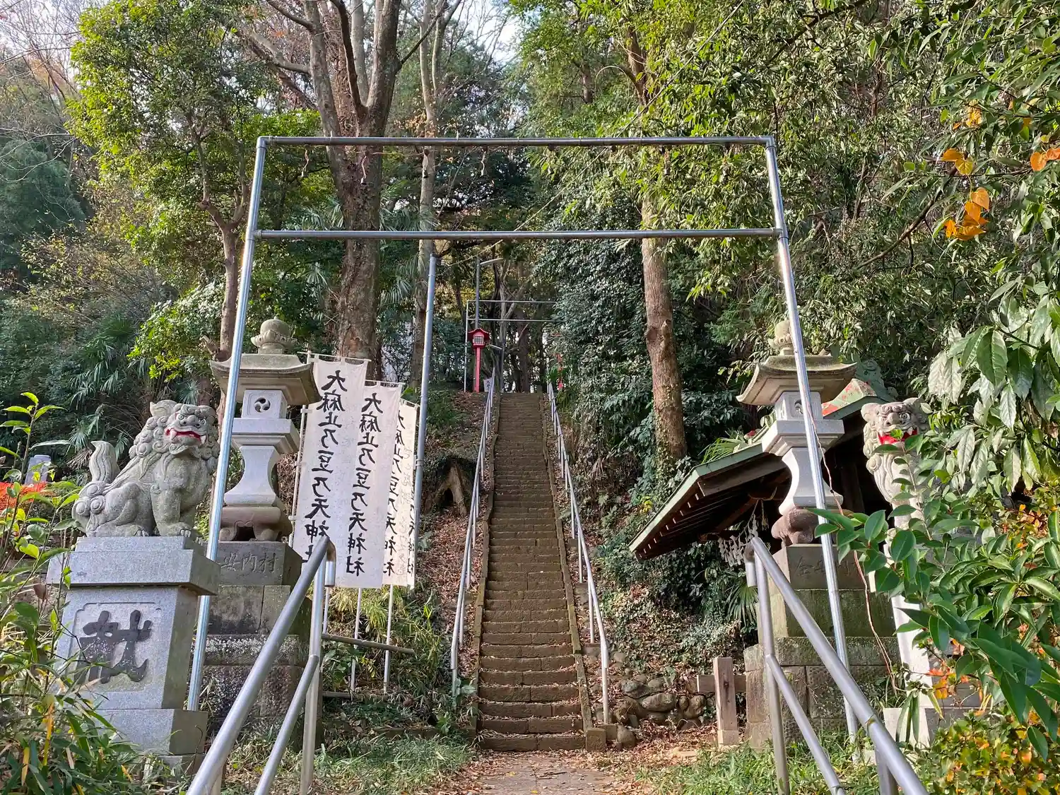階段の途中から前方を見上げる。階段両側にある新しい<狛犬>。