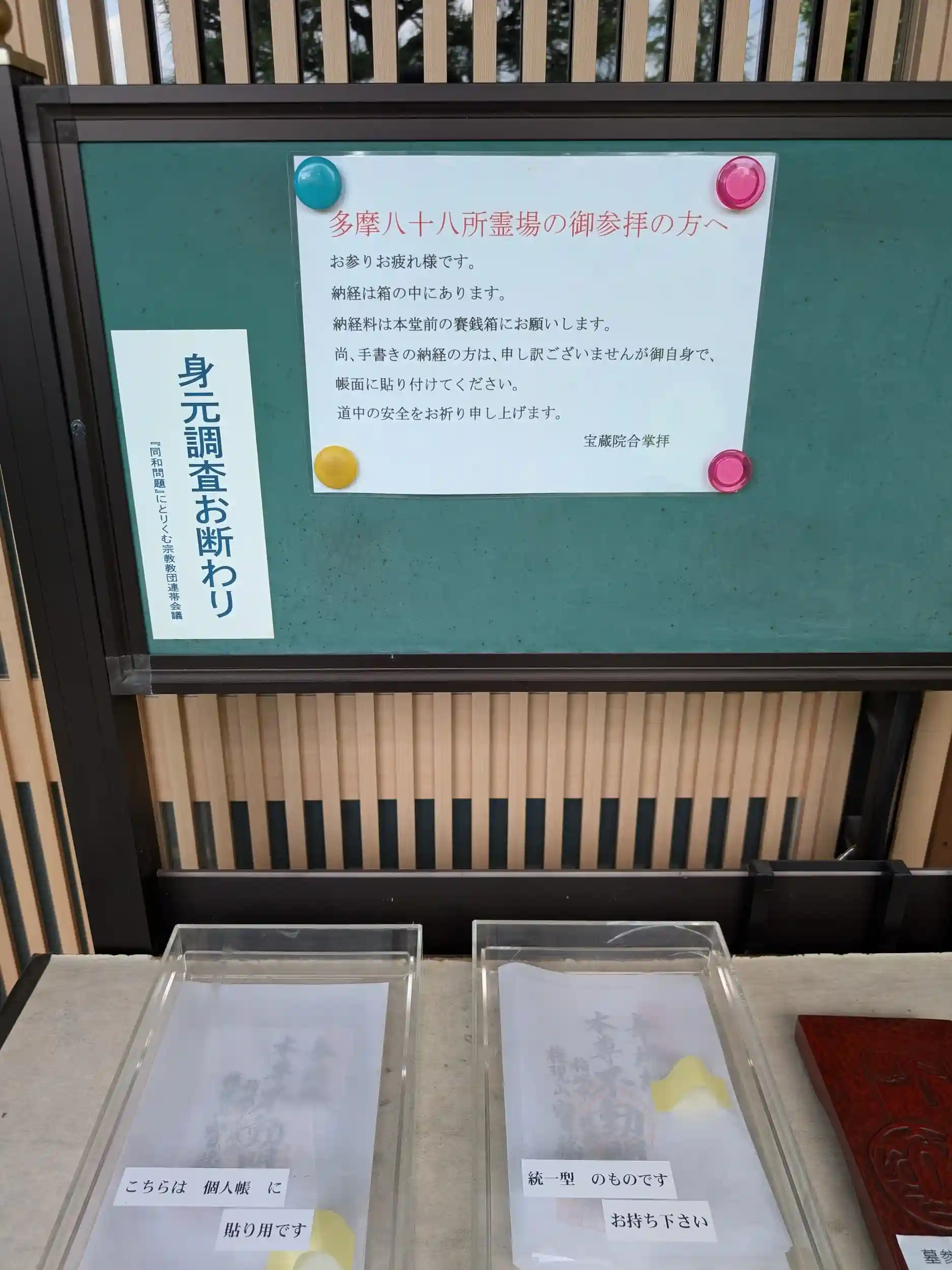 多摩新四国八十八ヶ所の第九番、宝蔵院さんの御朱印を書置きでいただく。駐車場は完備されていますがお寺までの道幅が狭かったです。寺務所入口前に専用納経帳用のものと通常御朱印帳用のものと2種類書置きで置かれておりました。