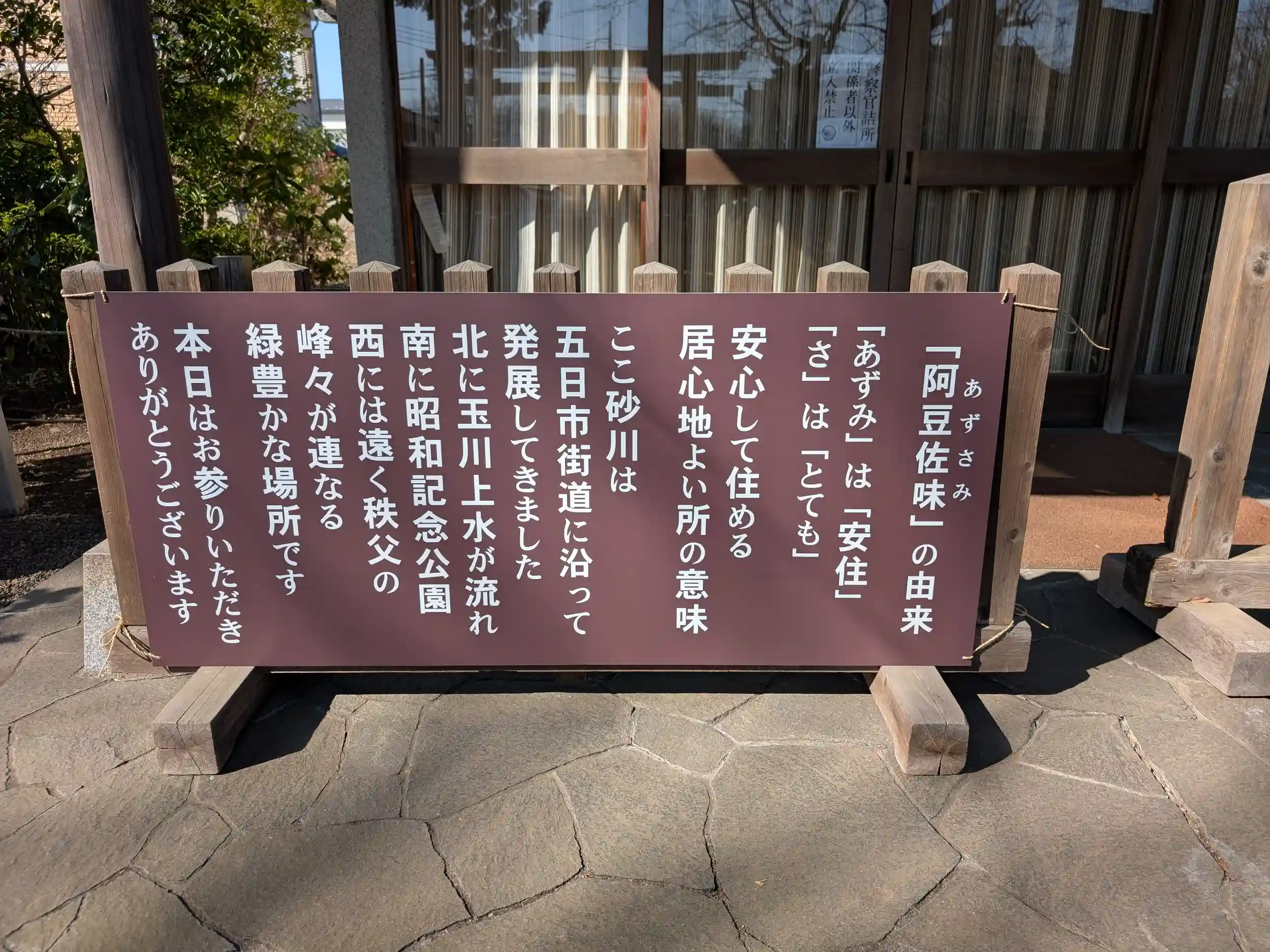 阿豆佐味天神社の御朱印を書置きで拝受。あずさみの由来は安心して住める居心地の良い場所とのことです。