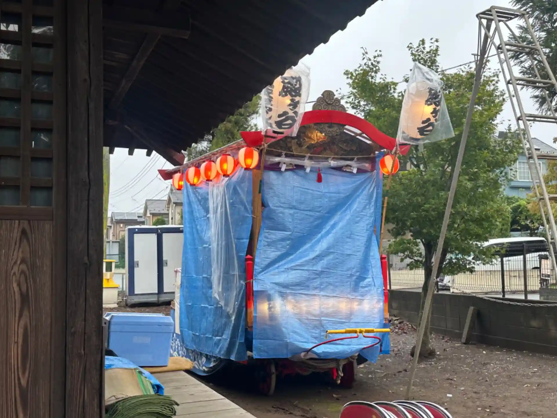 どうやら10月の第一日曜が当社の祭禮日だったようで、拝殿横に待機中の山車、神社に着いたとき境内から出てきて出発した山車を見かけました。小雨が降る中ですが決行したようです。
