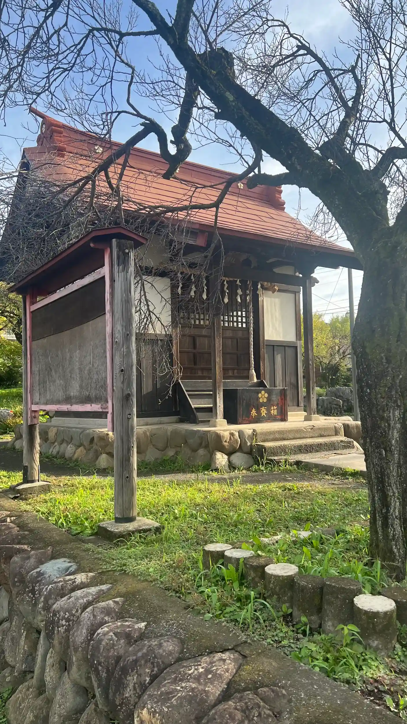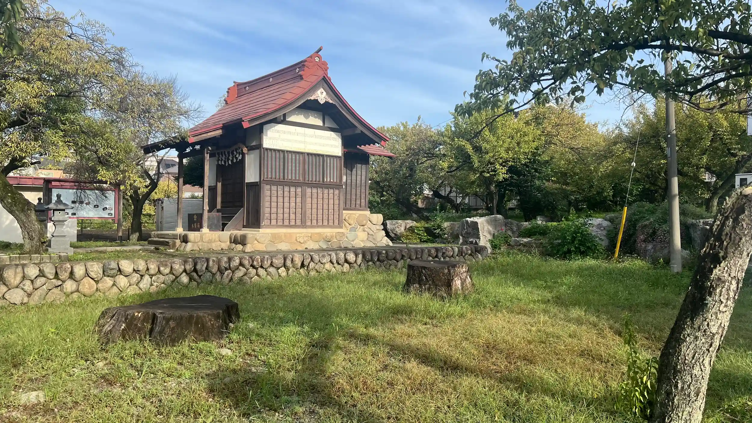 社殿は神社の顔ともいえる建物で、特に印象的なのは、やや赤みを帯びた朱色の銅板屋根。年月を経て落ち着きを帯びつつも、陽光を受けると鮮やかに輝き、参拝者の目を引きつけます。境内にはかつての巨木が二本残されていましたが、現在は切断され、太い切り株となってその存在感を示しています。おそらく安全上の理由から伐採されたものと思われますが、幹の太さからはかなりの樹齢であったことがうかがえ、天神様とともに長い時を過ごしてきた歴史を感じさせます。