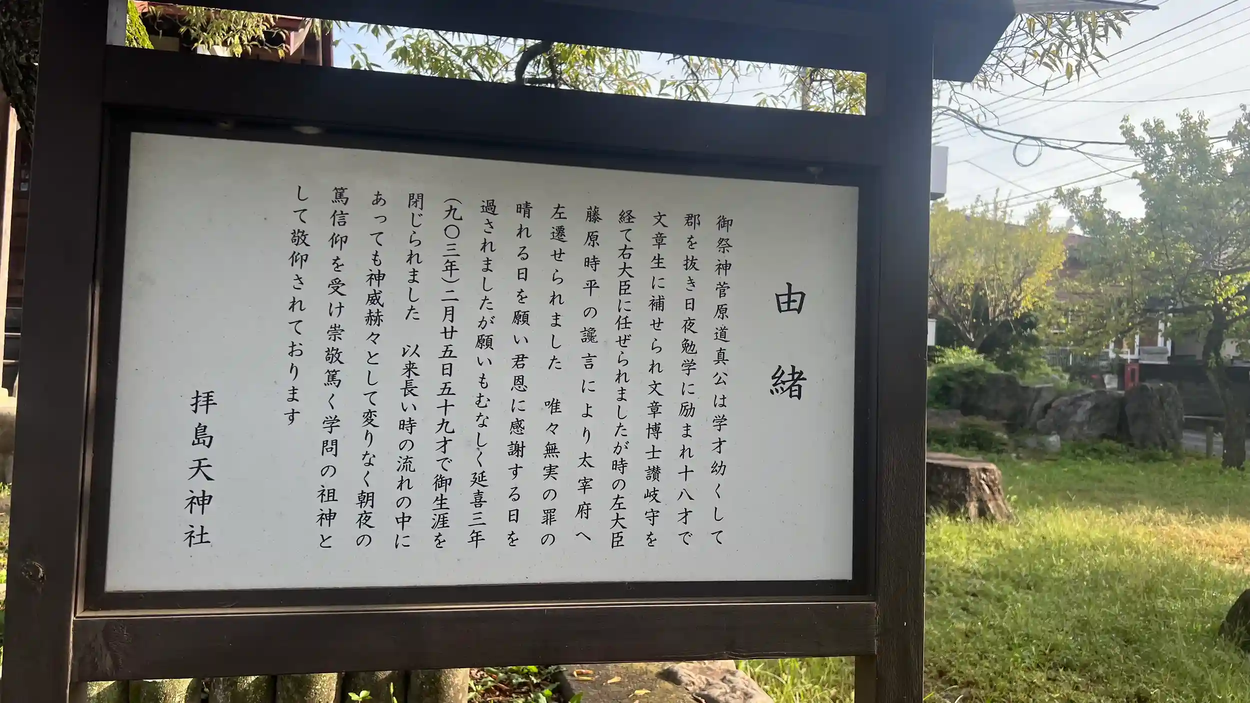 社殿の正面に掲げられた扁額には、力強く「拝島天神社」と墨痕鮮やかに記されており、参拝者を迎え入れています。境内の石灯籠は比較的新しいもので、近年整備が行われたことが分かります。全体としては大規模ではないながらも、地域に根ざし、静謐で落ち着いた雰囲気を保つ神社であり、学業成就や合格祈願に訪れる人々を今もなお見守り続けているといえるでしょう。