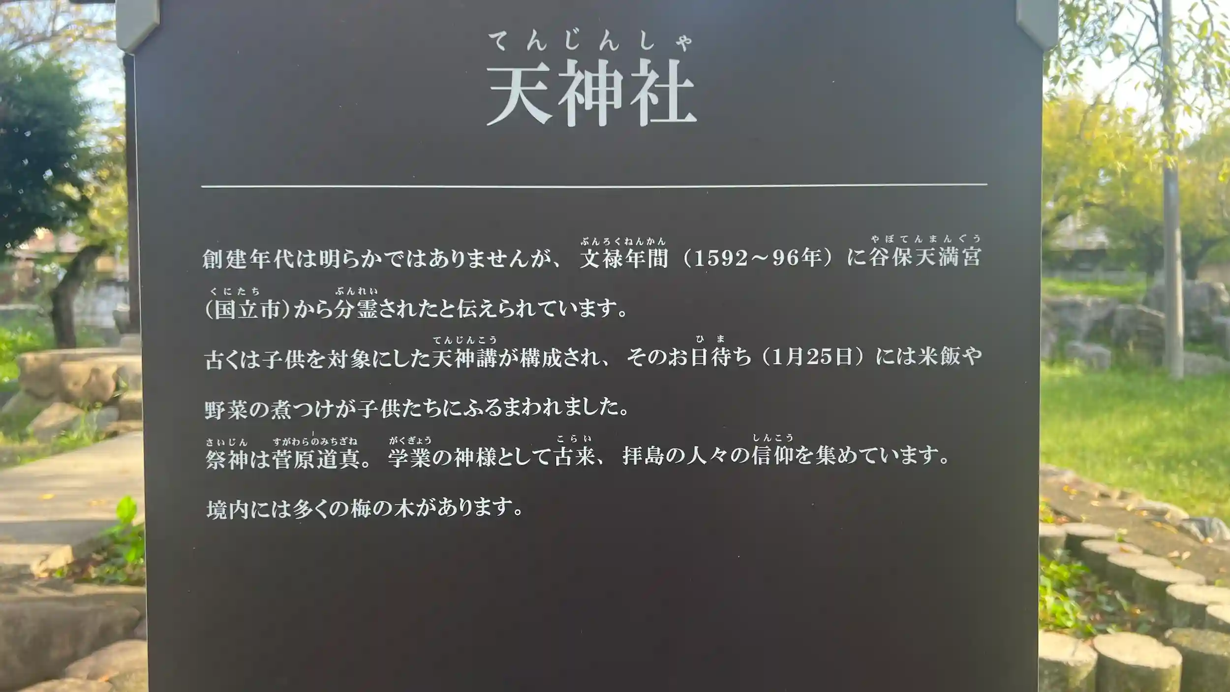御祭神は学問の神として知られる菅原道真公であり、境内の由緒書によれば、創建年代は明確には伝わらないものの、文禄年間(16世紀末)に国立市の谷保天満宮より分霊を勧請して創建されたと記されています。谷保天満宮は関東三大天神の一つとして知られ、そこから分霊を受けて成立したこの神社もまた、地域における信仰の拠点として長きにわたり親しまれてきたことがうかがえます。