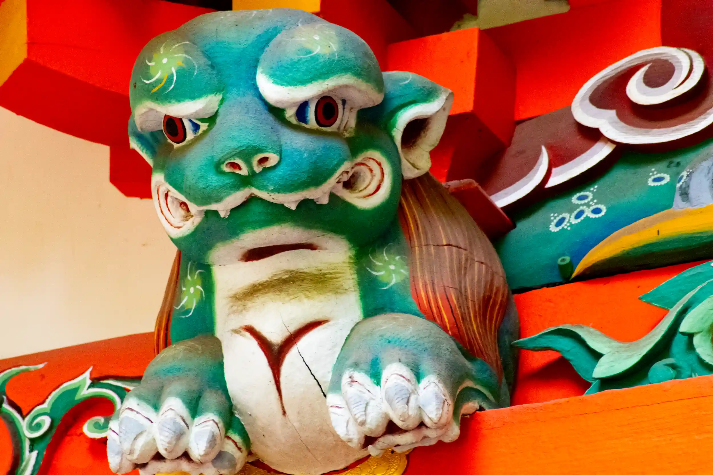 拝殿は一見普通に見えますが、よく見ると彫刻がいたるところに施されています。拝殿には壮麗な龍の彫刻をはじめ素朴で温かみのある猿の彫刻や数々の鳥の彫刻があしらわれています。また、1855に建てられた極彩色の本殿の彫刻には目を見張るものがあります。中国の白居易[白楽天]の「竹林の七賢」を題材にして、こちらでは、本殿の三面に九賢人が配されています。そればかりではなく獅子をはじめ龍や朱雀など多くの可愛らしい彫刻で埋め尽くされています。こちらの拝殿と本殿を見ていると、御朱印を待つ時間もきっといいひとときに変えてくれると思われます。