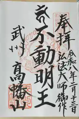 真ん中に梵字(不動明王)不動明王と書かれ、右に弘法大師御作の文字、右上に東国花の寺百ヶ寺の印、真ん中に蓮華座に梵字(不動明王)の火炎宝珠印、左上に東国花の寺20周年の花印、左下に武州高幡山の文字、武州高幡山の印が押されています。