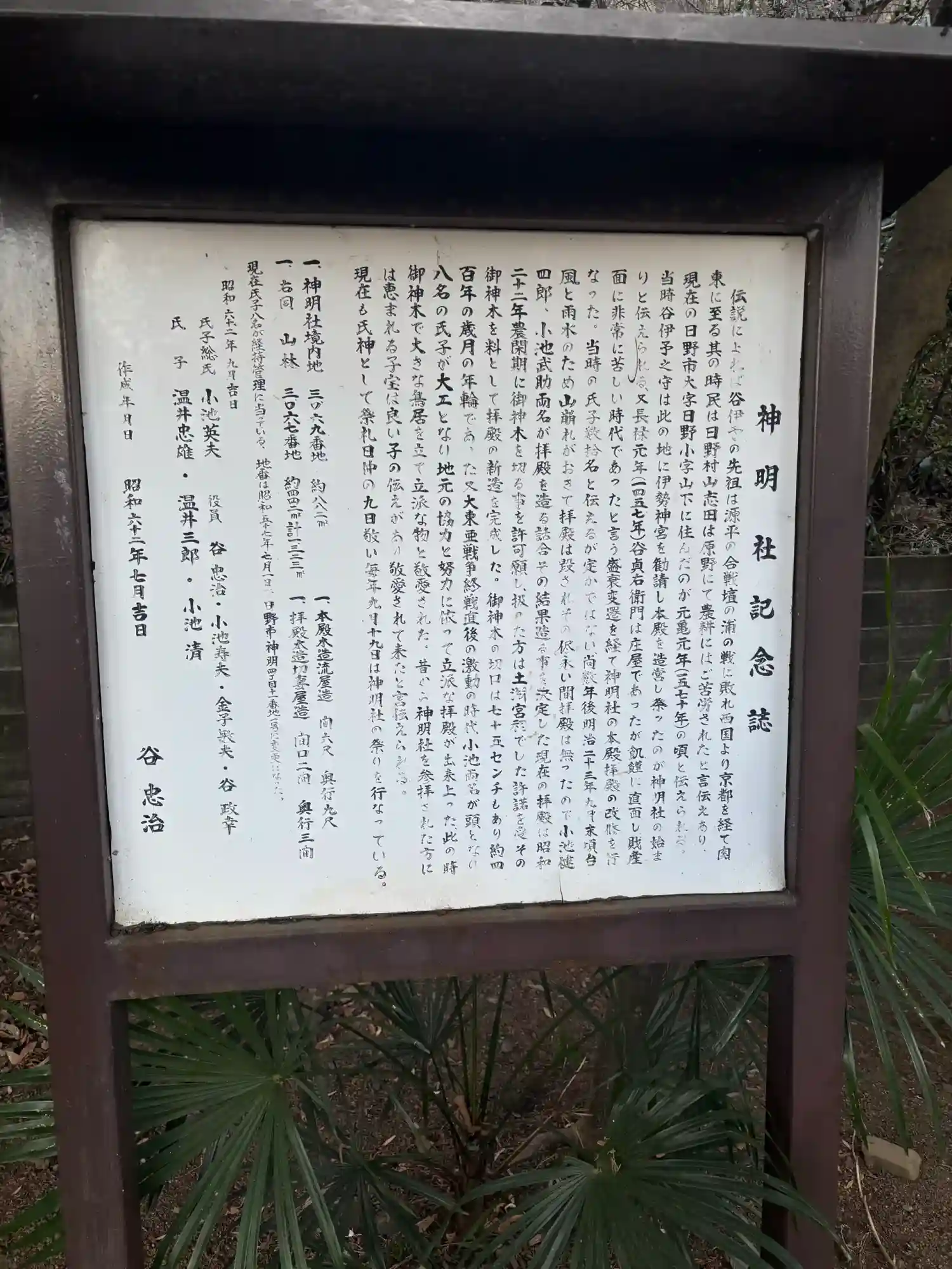 | ご由緒 | 創祀年代元亀元年(一五七〇)と伝える。元亀元年、谷伊予という人が伊勢皇太神宮を勧請し、今の地に社殿を造営した。享保二十年伊予の子孫谷源六郎が、土淵山観音院普門寺に寄進して社殿を再建した。江戸時代普門寺住職によって祭儀が行われていたが、明治二年以後八坂神社の境外末社として、祭祀が行われている。(日野市史より) |