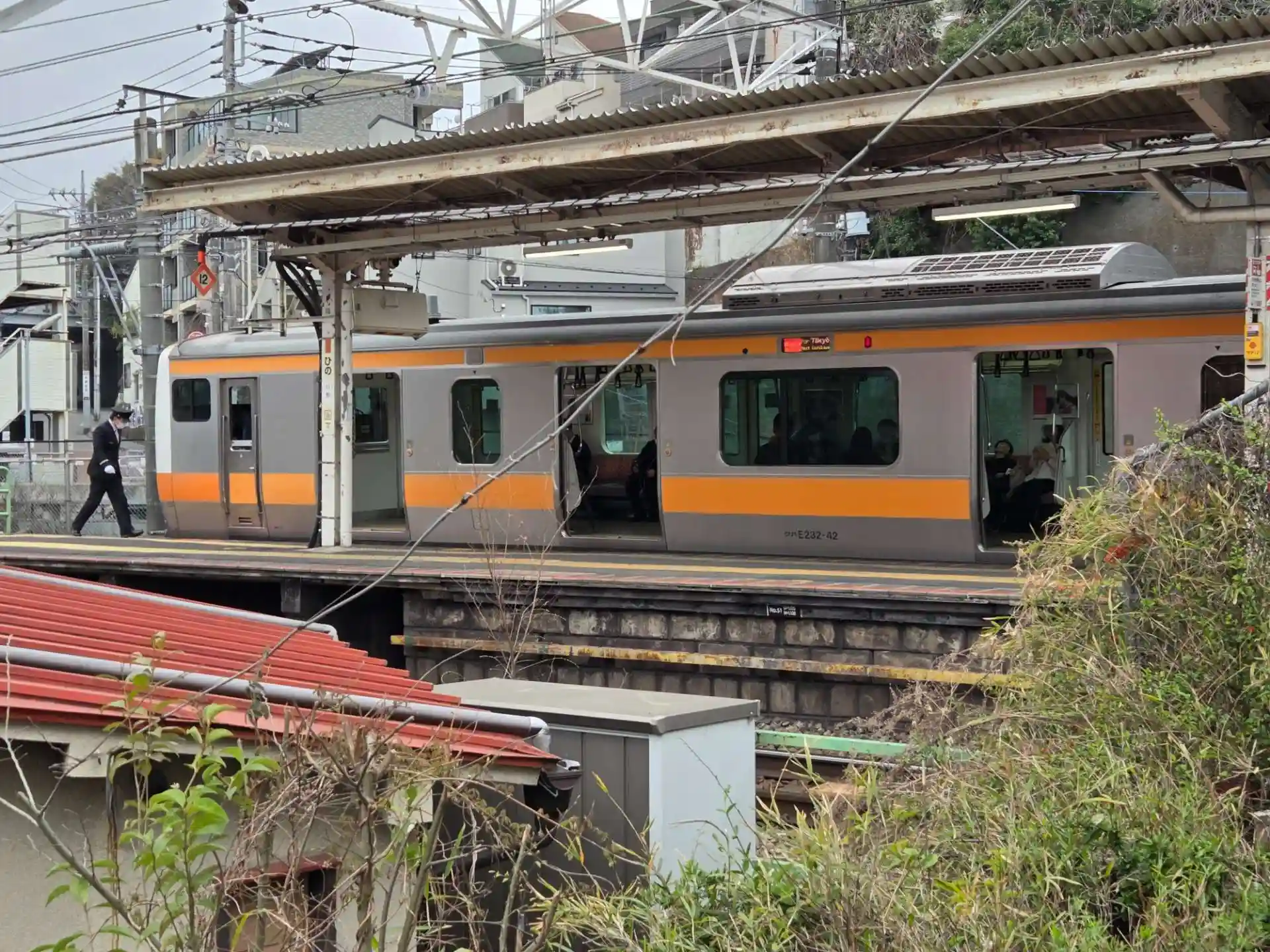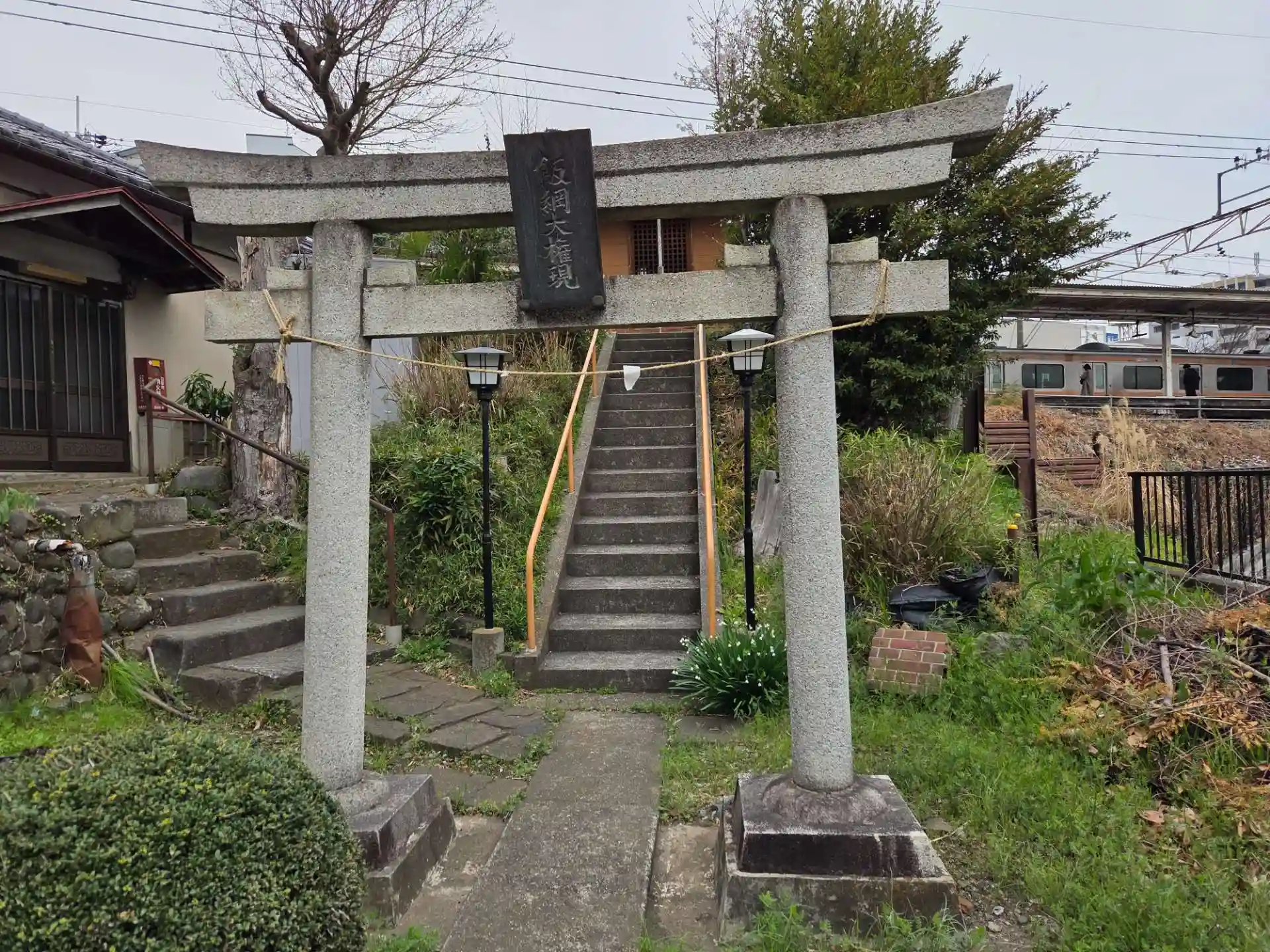 日野駅前で、神社からホームが見えます。