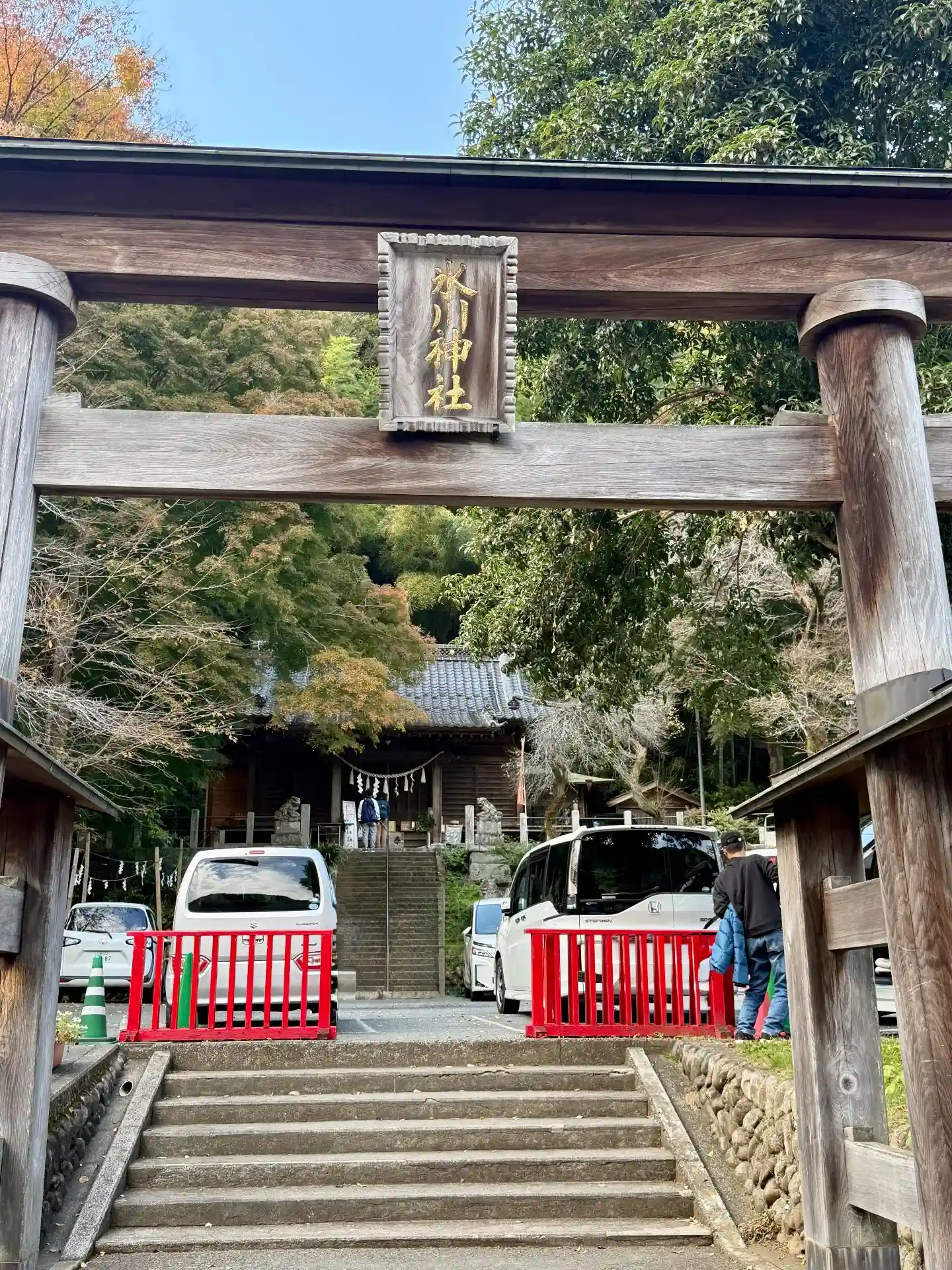 高尾山薬王院を出て高尾山口駅前まで戻ると、目の前に朱塗りの鳥居と駐車場の建物に書かれた氷川神社の看…