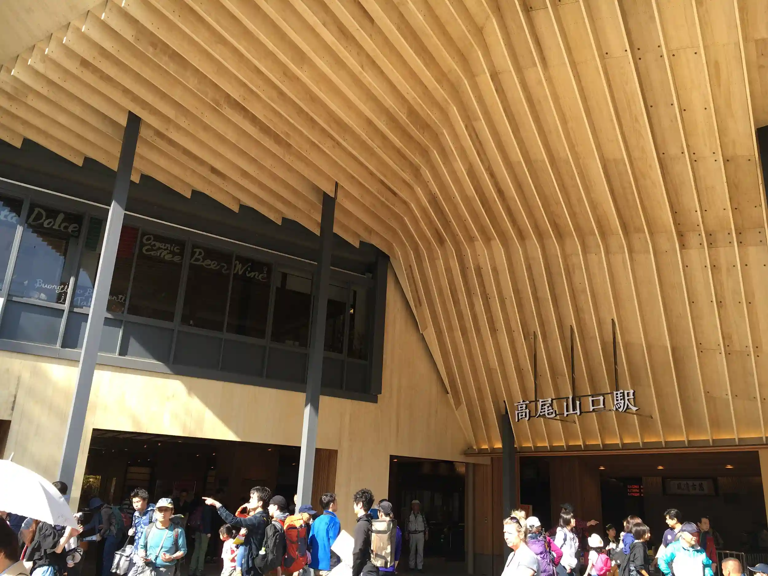 京王線高尾山口駅。京王線の終着駅です。駅舎は2015年に完成したばかり。だれが見ても分かる隈研吾氏のデザインで、山麓の駅とは思えない豪華な駅舎です。ここから山頂に向けて歩きます。